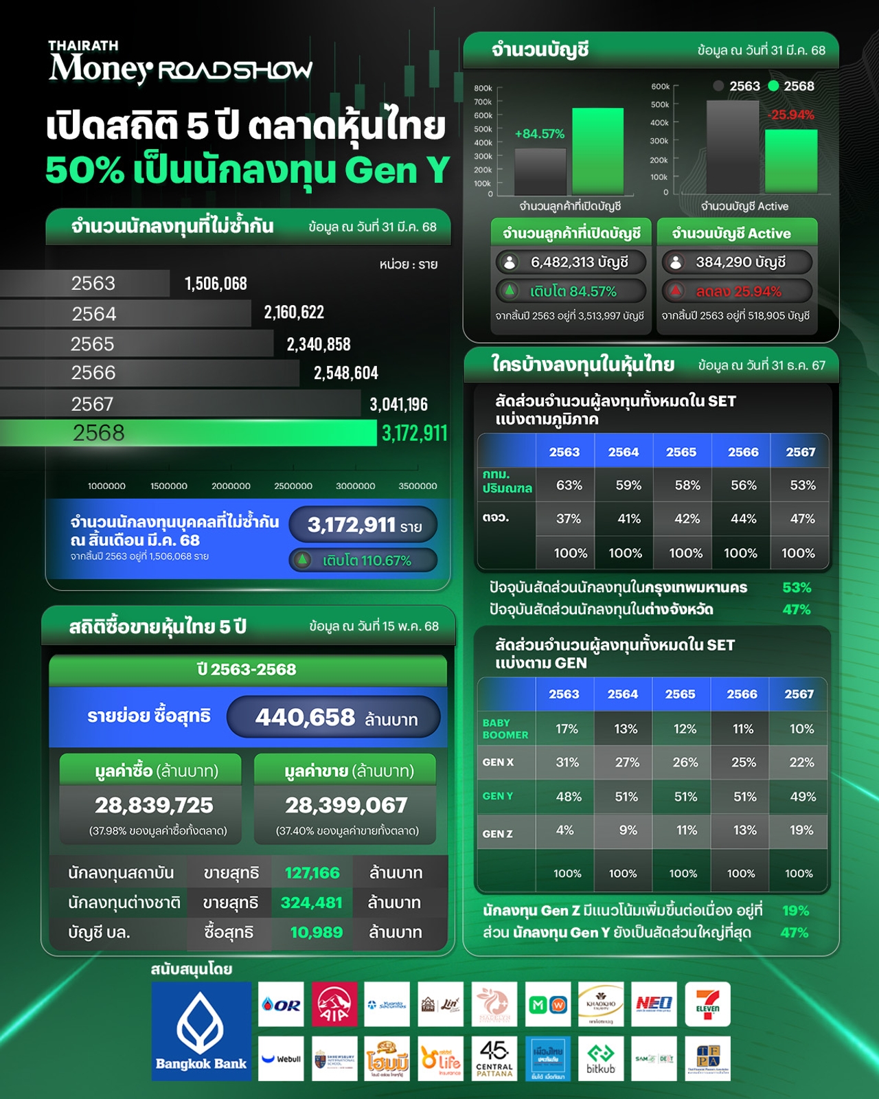 การเพิ่มขึ้นของนักลงทุนรายย่อย จากกลุ่ม Gen Y และ Gen Z ที่เข้ามามีบทบาทกับตลาดหุ้นไทยมากขึ้น ทำให้มีฐานนักลงทุนที่กว้างขึ้นและเด็กลง ซึ่งเป็นผลดีต่อสภาพคล่องและการพัฒนาตลาดในระยะยาว