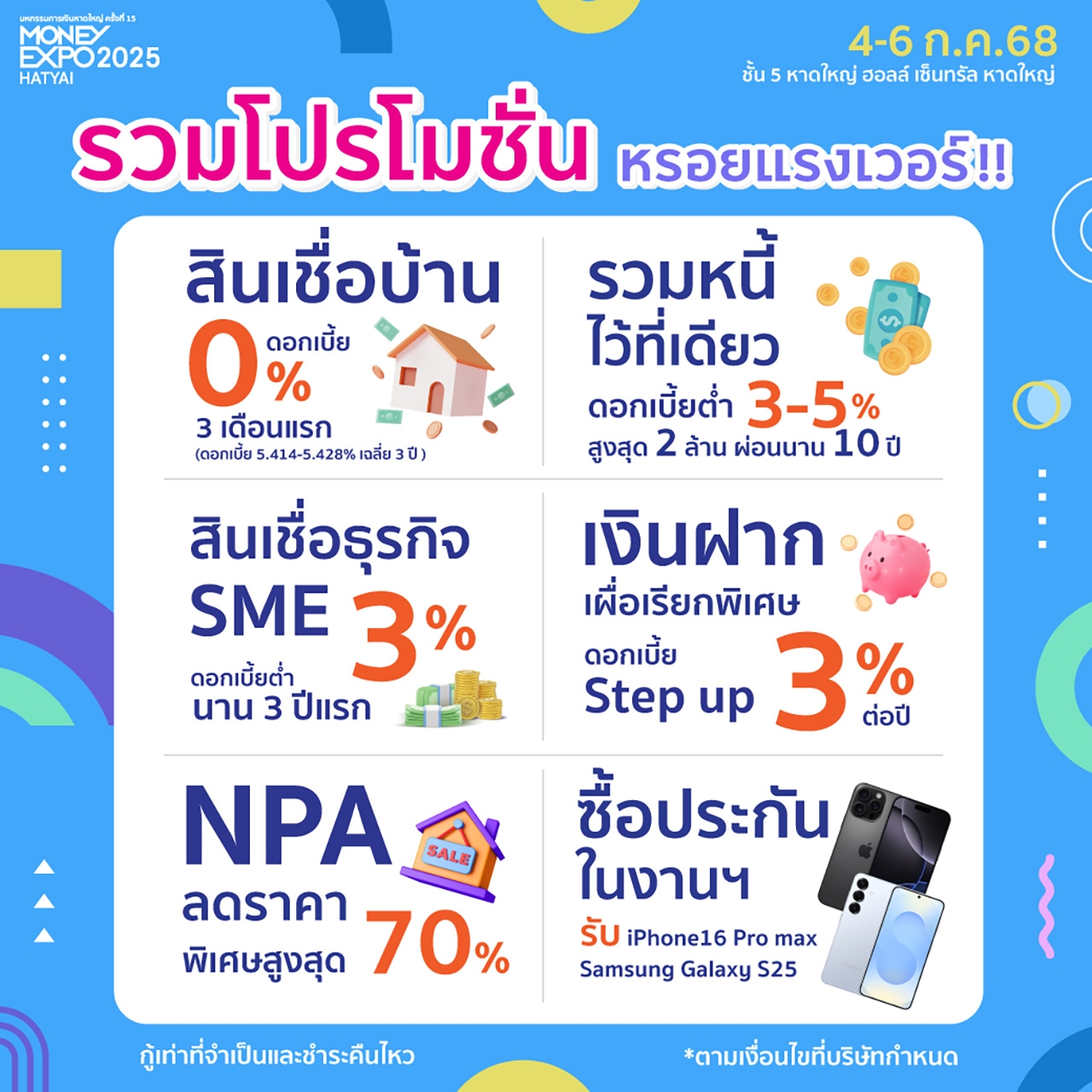 งานมหกรรมการเงินหาดใหญ่ ครั้งที่ 15 MONEY EXPO 2025 HATYAI แบงก์-นอนแบงก์-ประกัน-บล.-บลจ. กระหน่ำโปรโมชั่นแรงเอาใจพี่น้องชาวหาดใหญ่และภาคใต้ สินเชื่อบ้าน ดอกเบี้ย 0% นาน 3 เดือน NPA ลดสูงสุด 70% เงินฝากเผื่อเรียกพิเศษ ดอกเบี้ย Step up 3% ต่อปี สินเชื่อธุรกิจ SME ดอกเบี้ยต่ำ 3.00% ต่อปี นาน 3 ปี รวมหนี้ไว้ที่เดียว ดอกเบี้ยต่ำ 3-5% สูงสุด 2 ล้าน ผ่อนนาน 10 ปี ซื้อประกันในงาน รับ iPhone 16 Pro Max / Samsung Galaxy S25 พร้อมฟังสัมมนา จากกูรูด้านการเงิน ฟรี! ในระหว่างวันที่ 4-6 กรกฎาคม 2568 ณ หาดใหญ่ ฮอลล์ ชั้น 5 และลานโปรโมชั่น ชั้น 1 ศูนย์การค้าเซ็นทรัล หาดใหญ่ จังหวัดสงขลา