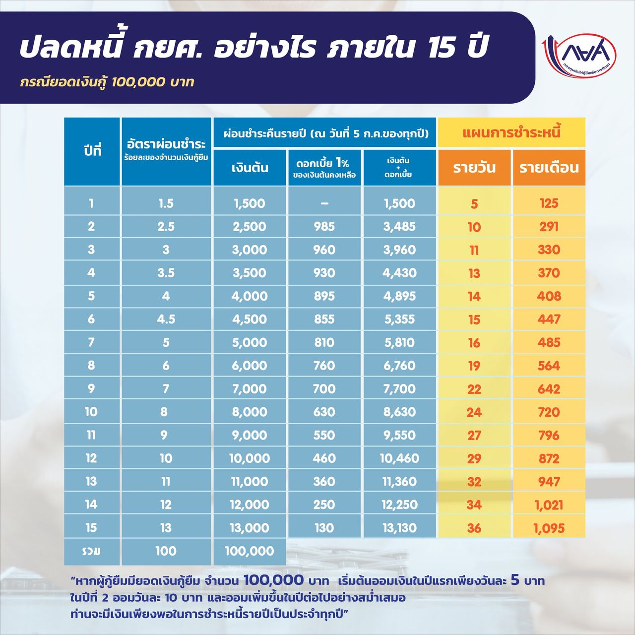 ในทุกเดือนผู้กู้จะต้องมีวินัยในการหักค่าใช้จ่ายเพื่อจ่ายหนี้ กยศ. เพียงเก็บเงินวันละ 15 บาทก็สามารถปลดหนี้ กยศ. ได้ โดยเงินจำนวนดังกล่าว สามารถเริ่มนำมาชำระหนี้ กยศ. ได้เลยหลังเรียนจบ