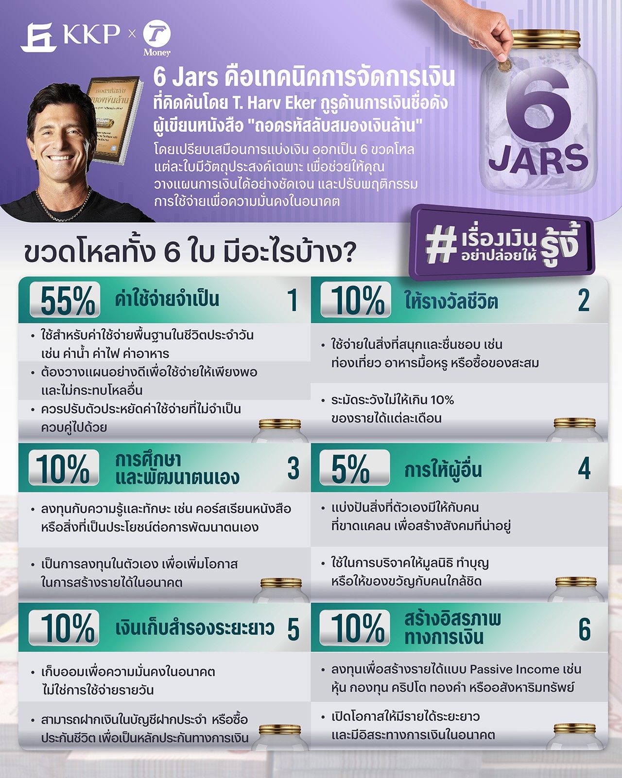6 Jars คือเทคนิคการจัดการเงินที่คิดค้นโดย T. Harv Eker กูรูด้านการเงินชื่อดัง ผู้เขียนหนังสือ "ถอดรหัสลับสมองเงินล้าน" โดยเปรียบเสมือนการแบ่งเงินออกเป็น 6 ขวดโหล แต่ละใบมีวัตถุประสงค์เฉพาะ เพื่อช่วยให้คุณวางแผนการเงินได้อย่างชัดเจน และปรับพฤติกรรมการใช้จ่ายเพื่อความมั่นคงในอนาคต