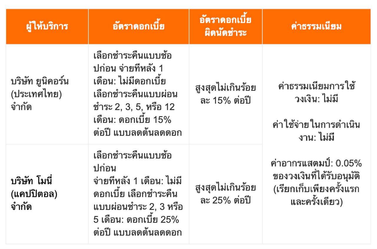 หมายเหตุ: หากสมัคร SPayLater ก่อนวันที่ 4 สิงหาคม ปี 66 จะใช้สินเชื่อบริษัท ยูนิคอร์น (ประเทศไทย) จำกัด แต่หากสมัครหลังวันที่ 4 สิงหาคม ปี 66 จะใช้สินเชื่อของบริษัท โมนี่ (แคปปิตอล) จำกัด ซึ่งทั้งคู่จะมีอัตราดอกเบี้ยที่แตกต่างกัน