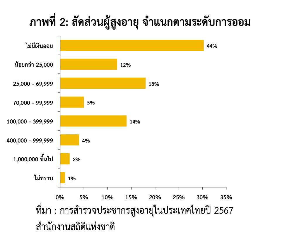 ดังนั้นถ้าเบี้ยผู้สูงอายุไม่พอใช้ชีวิต คนไทยกลุ่มเกษียณแล้วมีเงินออมพอใช้แค่ไหน จากข้อมูลพบว่า 44% ของผู้สูงอายุไทยไม่มีเงินออม หรือหากมีพอออมก็ไม่มากเท่าไหร่นัก ส่วนหนึ่งอาจเป็นเพราะปัญหาที่เหล่าผู้สูงอายุมีรายได้น้อยแต่รายจ่ายเยอะ ไหนจะหนี้ที่พุ่งสูงอีก จึงเป็นเรื่องยากที่จะมีเงินเหลือพอให้ออม