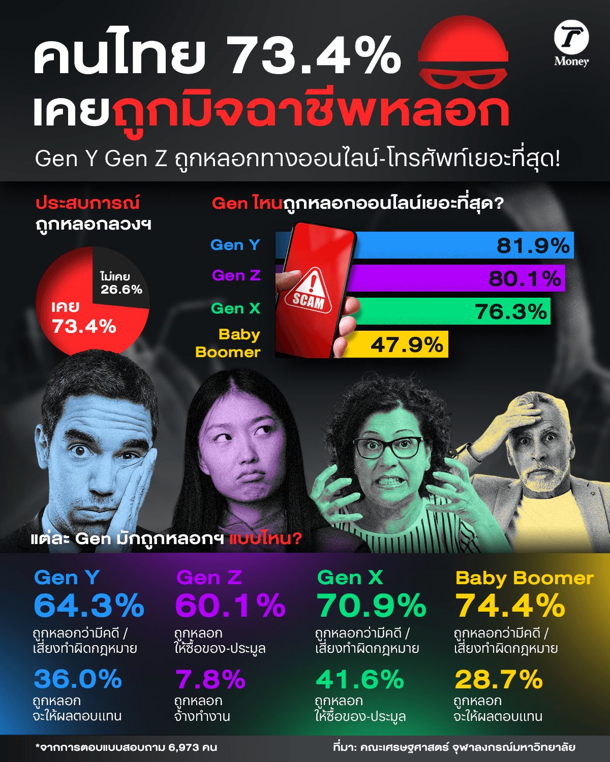 เรื่องเหล่านี้เกิดขึ้นแทบจะพบได้บ่อยในชีวิตประจำวันของเราไปแล้ว สะท้อนจากผลสำรวจล่าสุดพบว่า 73.4% คนไทยเคยถูกมิจฉาชีพหลอกลวง ที่น่าตกใจกว่าคือเหตุการณ์เหล่านี้เกิดขึ้นกับ Gen Y และ Gen Z มากกว่า Gen อื่นๆ สาเหตุเพราะอะไรกันแน่