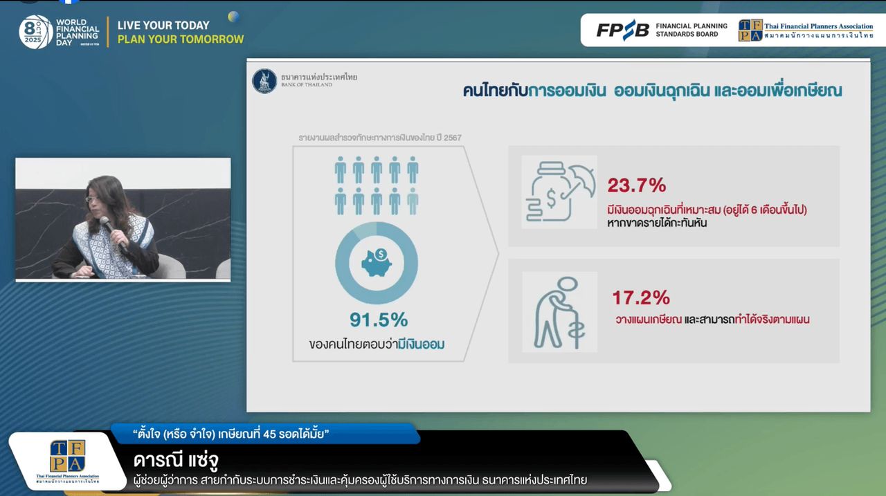 “ดารณี แซ่จู” ผู้ช่วยผู้ว่าการสายกำกับระบบการชำระเงินและคุ้มครองผู้ใช้บ ริการทางการเงิน ธนาคารแห่งประเทศไทย (ธปท.) อธิบายว่า ปัญหาไม่ได้อยู่ที่คนไทยไม่มีเงินออม แต่คือ ออมแบบไม่พอ และออมแบบไม่วางแผน เพราะข้อมูลสำรวจที่พบว่า แม้ 91.5% ของคนไทยจะตอบว่ามีเงินออม แต่มีเพียง 23.7% เท่านั้นที่มีเงินออมฉุกเฉินพออยู่ได้ 6 เดือน และไม่ถึง 2 ใน 10 คนที่มีแผนเกษียณชัดเจนและทำได้จริง