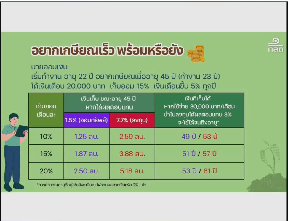 เธอยกตัวอย่าง “นายเอ” อายุ 22 ปี อยากเกษียณตอนอายุ 45 เงินเดือนเริ่มต้น 20,000 บาท ออม 15% ต่อปี สมมุติรายได้เพิ่มปีละ 5% หากวางแผนตั้งแต่วันแรก และลงทุนในสินทรัพย์ที่เหมาะสม โอกาสเกษียณได้จริง ยังมี แต่ถ้าเริ่มช้า แม้แต่เวลา 23 ปีก็อาจไม่พอ