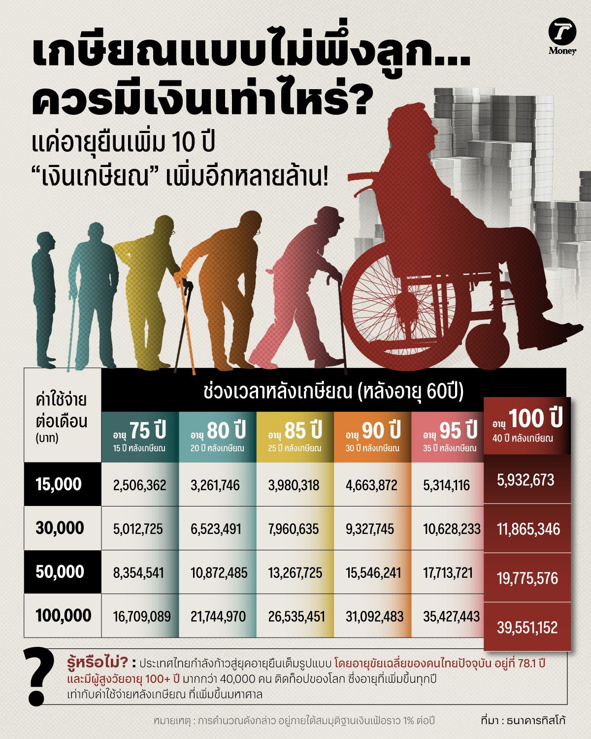 Infographic นี้ได้คำนวณเงิน ที่ต้องเตรียมไว้ ณ อายุ 60 ปี ตามไลฟ์สไตล์และระยะเวลาที่คาดหวังจะมีชีวิตอยู่ โดยตัวเลขที่น่าตกใจ จะพบได้ว่า แค่การยืดอายุจาก 80 ปีไปถึง 90 ปี (เพิ่ม 10 ปีหลังเกษียณ) สำหรับผู้ที่ต้องการค่าใช้จ่ายเดือนละ 50,000 บาท เงินที่ต้องเตรียมเพิ่มขึ้นจาก 10.8 ล้านบาท เป็น 15.5 ล้านบาท (เพิ่มขึ้นประมาณ 4.7 ล้านบาท)