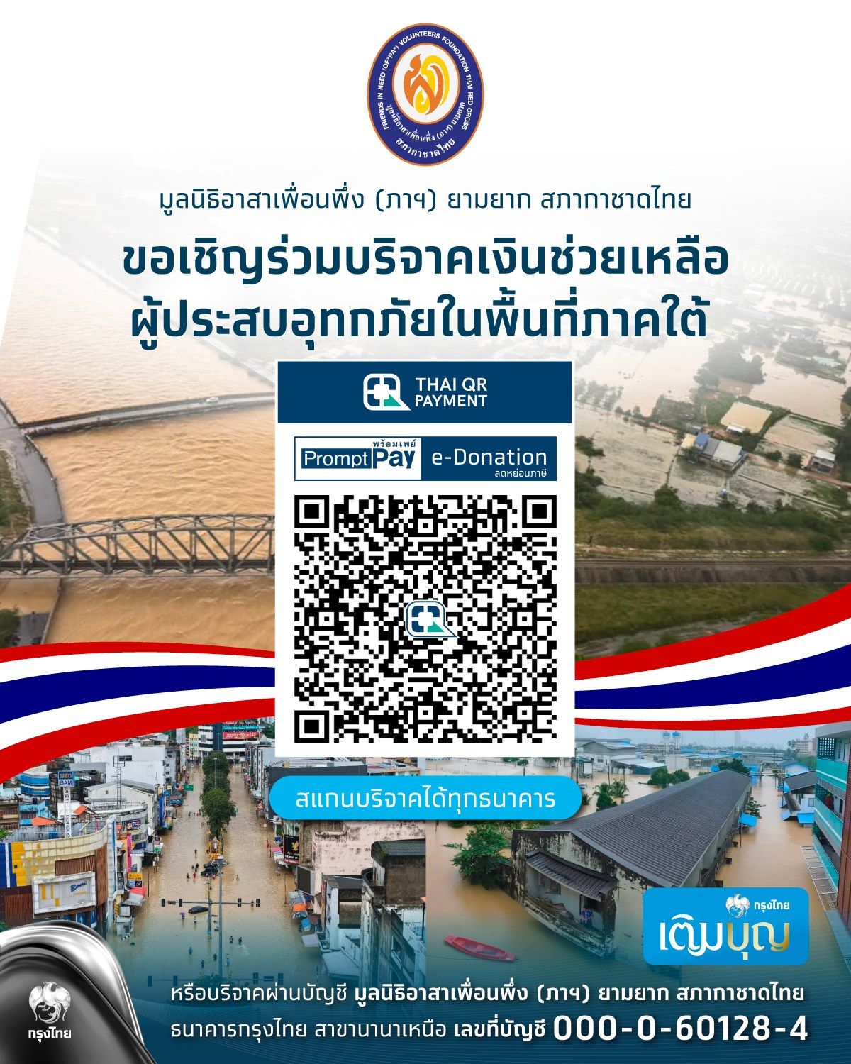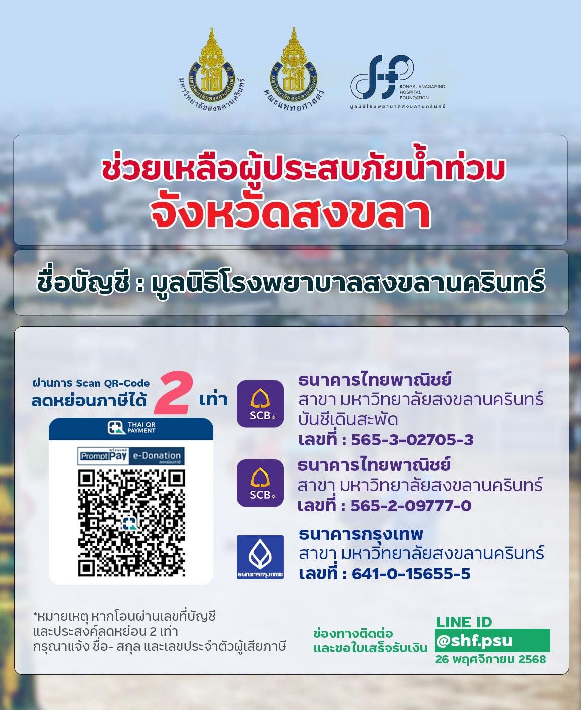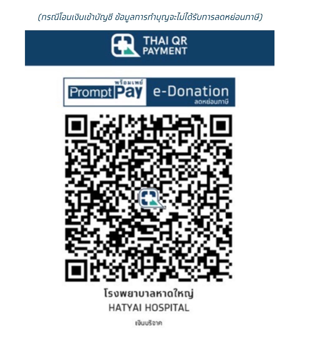 ร่วมบริจาคช่วยเหลือผู้ประสบภัยน้ำท่วมจังหวัดสงขลาผ่านการสแกน Qr-Code e-Donation (ลดหย่อนภาษีได้ 2 เท่าอัตโนมัติ ในนามเจ้าของบัญชีเท่านั้น ไม่จำเป็นต้องขอใบเสร็จเพื่อยื่นลดหย่อนภาษี) หรือ โอนผ่านบัญชี