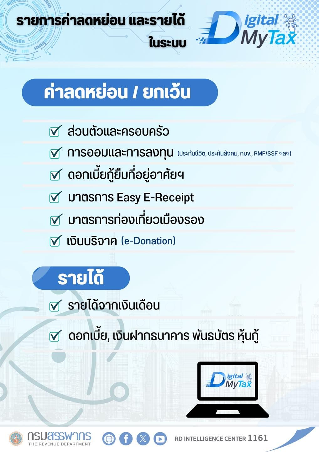 D-MyTax คือระบบที่กรมสรรพากรพัฒนาขึ้นเพื่อเชื่อมโยงข้อมูลรายได้และค่าลดหย่อนจากหน่วยงานต่างๆ มาไว้ในระบบออนไลน์ จุดเด่น คือ