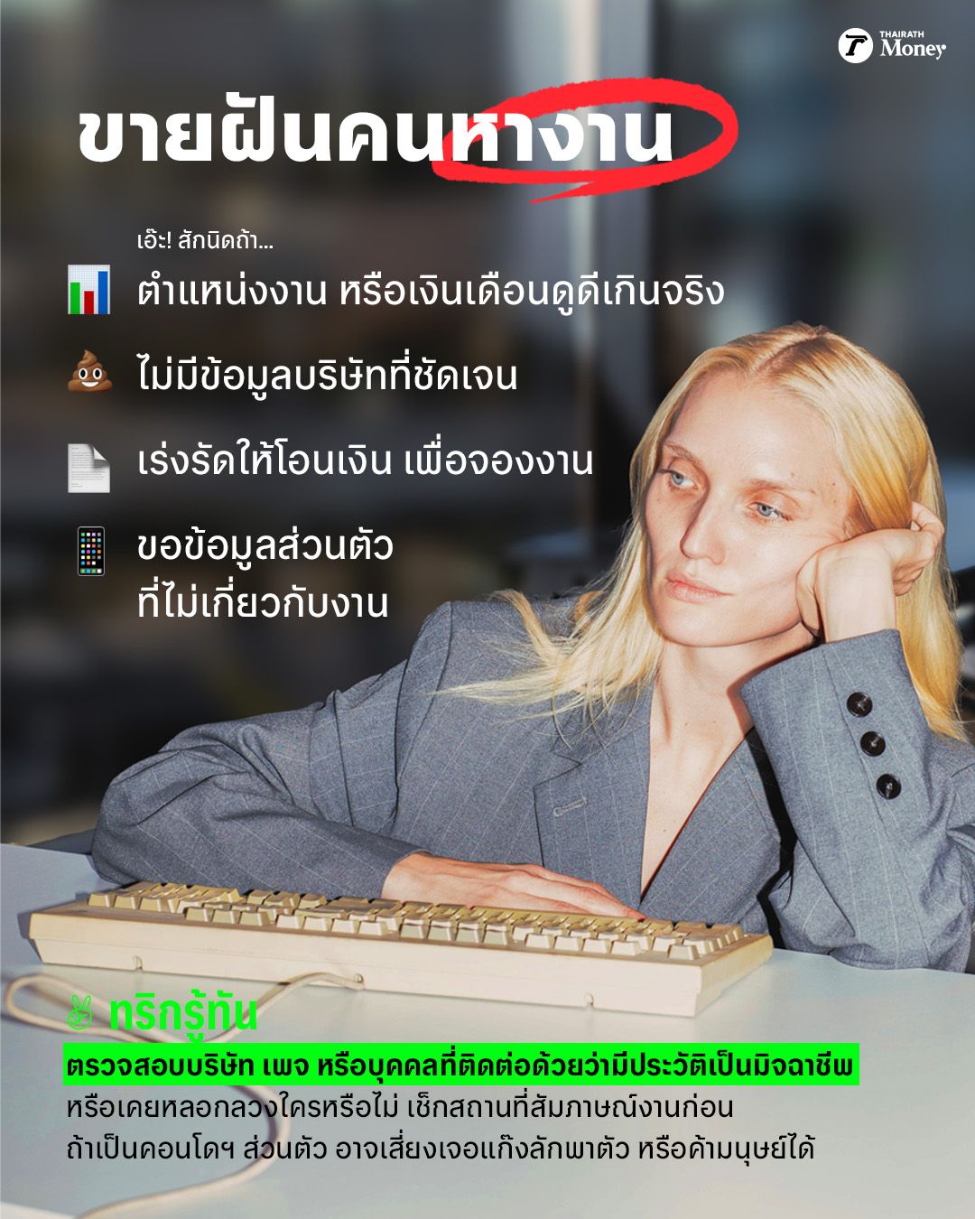 ทริกรู้ทัน: ตรวจสอบบริษัท เพจ หรือบุคคลที่ติดต่อด้วยว่ามีประวัติเป็นมิจฉาชีพ หรือเคยหลอกลวงใครหรือไม่ เช็กสถานที่สัมภาษณ์งานก่อน ถ้าเป็นคอนโดฯ ส่วนตัว อาจเสี่ยงเจอแก๊งลักพาตัว หรือค้ามนุษย์ได้