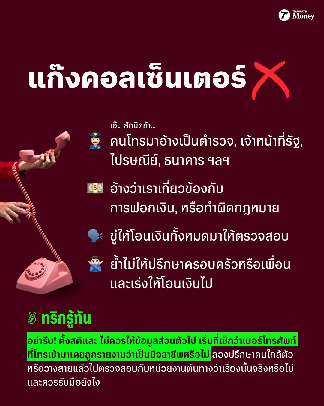 ทริกรู้ทัน: อย่ารีบ! ตั้งสติ และไม่ควรให้ข้อมูลส่วนตัวไป เริ่มที่เช็กว่าเบอร์โทรศัพท์ที่โทรเข้ามาเคยถูกรายงานว่าเป็นมิจฉาชีพหรือไม่ ลองปรึกษาคนใกล้ตัว หรือวางสายแล้วไปตรวจสอบกับหน่วยงานต้นทางว่าเรื่องนั้นจริงหรือไม่ และควรรับมือยังไง
