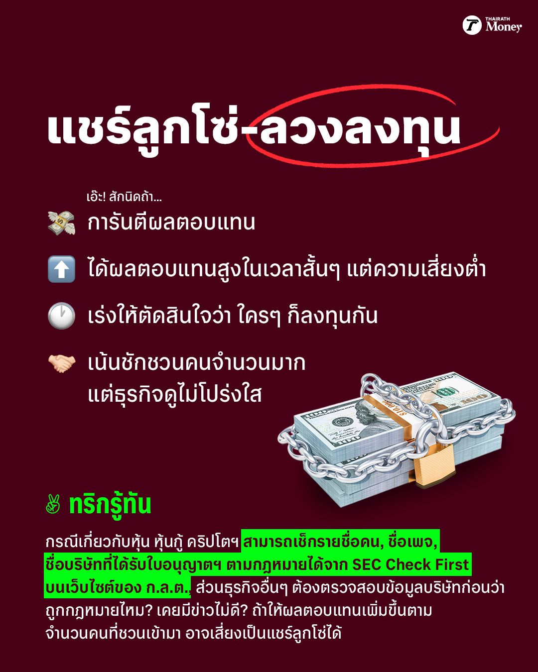 ทริกรู้ทัน: กรณีเกี่ยวกับหุ้น หุ้นกู้ คริปโตฯ สามารถเช็กรายชื่อคน, ชื่อเพจ, ชื่อบริษัทที่ได้รับใบอนุญาตฯ ตามกฎหมายได้จาก SEC Check First บนเว็บไซต์ของ ก.ล.ต., ส่วนธุรกิจอื่นๆ ต้องตรวจสอบข้อมูลบริษัทก่อนว่า ถูกกฎหมายไหม? เคยมีข่าวไม่ดี? ถ้าให้ผลตอบแทนเพิ่มขึ้นตามจำนวนคนที่ชวนเข้ามา อาจเสี่ยงเป็นแชร์ลูกโซ่ได้