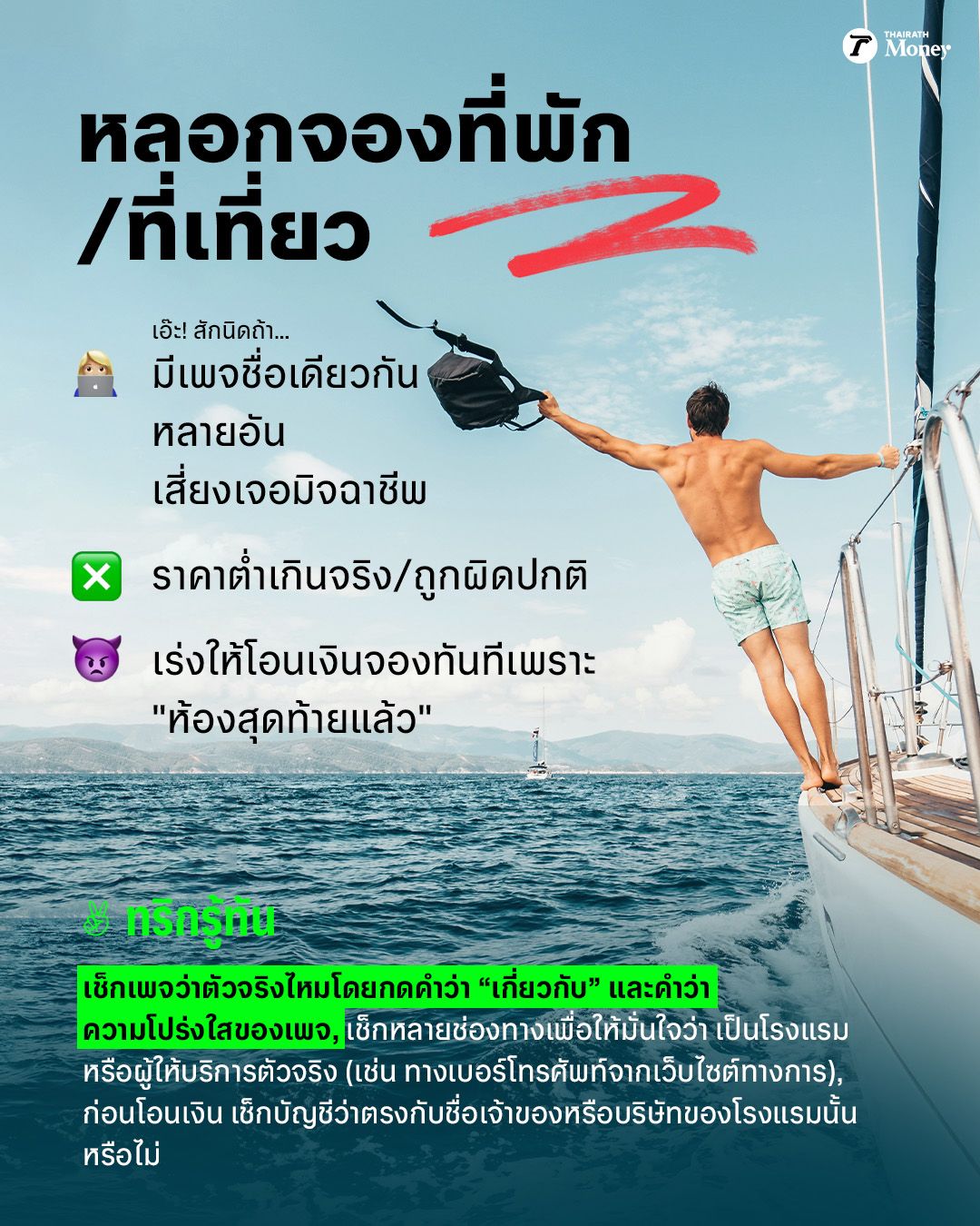 ทริกรู้ทัน: เช็กเพจว่าตัวจริงไหมโดยกดคำว่า “เกี่ยวกับ” และคำว่า ความโปร่งใสของเพจ, เช็กหลายช่องทางเพื่อให้มั่นใจว่า เป็นโรงแรมหรือผู้ให้บริการตัวจริง (เช่น ทางเบอร์โทรศัพท์จากเว็บไซต์ทางการ), ก่อนโอนเงิน เช็กบัญชีว่าตรงกับชื่อเจ้าของหรือบริษัทของโรงแรมนั้นหรือไม่