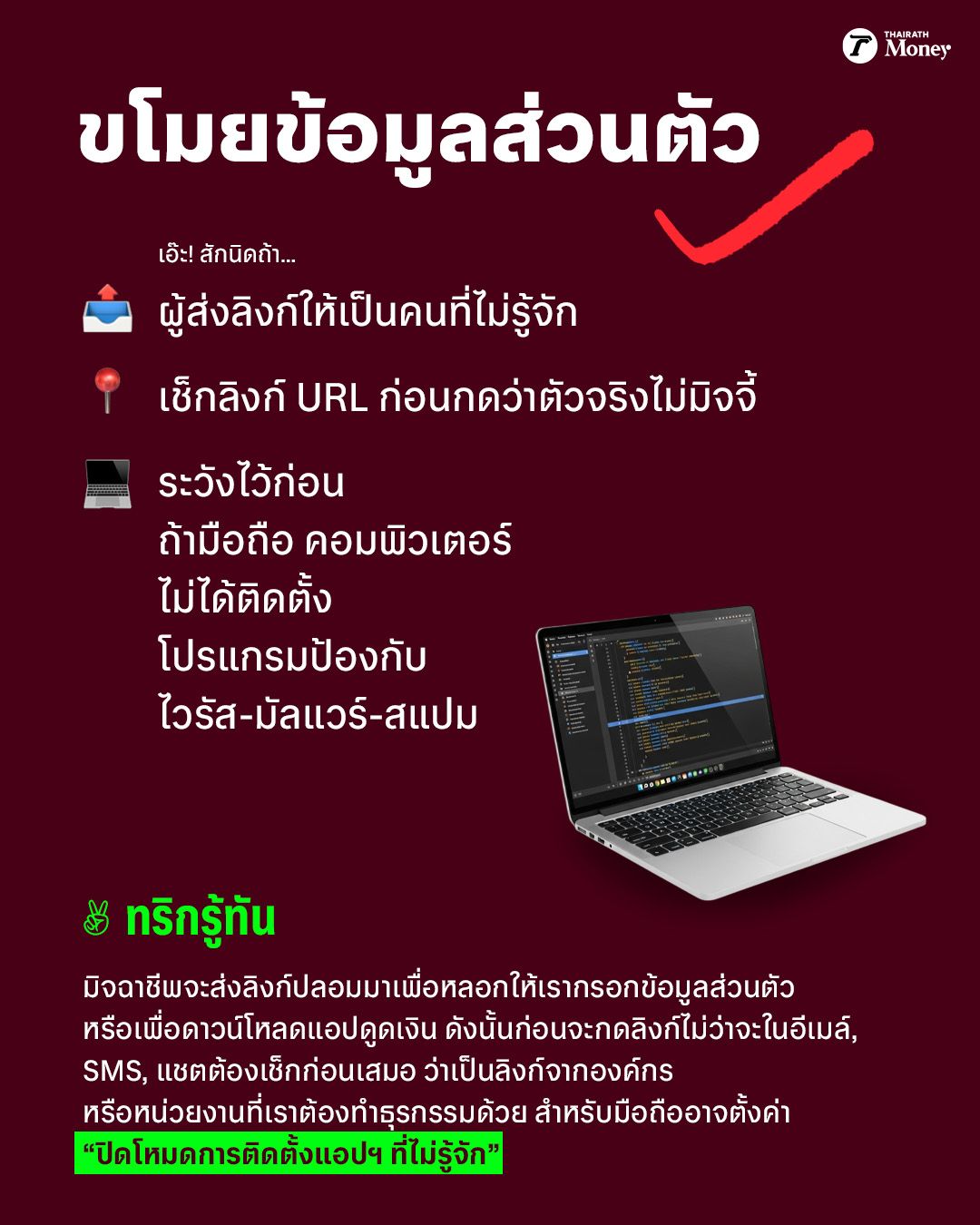 ทริกรู้ทัน: มิจฉาชีพจะส่งลิงก์ปลอมมาเพื่อหลอกให้เรากรอกข้อมูลส่วนตัว หรือเพื่อดาวน์โหลดแอปดูดเงิน ดังนั้นก่อนจะกดลิงก์ไม่ว่าจะในอีเมล์, SMS, แชตต้องเช็กก่อนเสมอ ว่าเป็นลิงก์จากองค์กร หรือหน่วยงานที่เราต้องทำธุรกรรมด้วย สำหรับมือถืออาจตั้งค่า “ปิดโหมดการติดตั้งแอปฯ ที่ไม่รู้จัก”