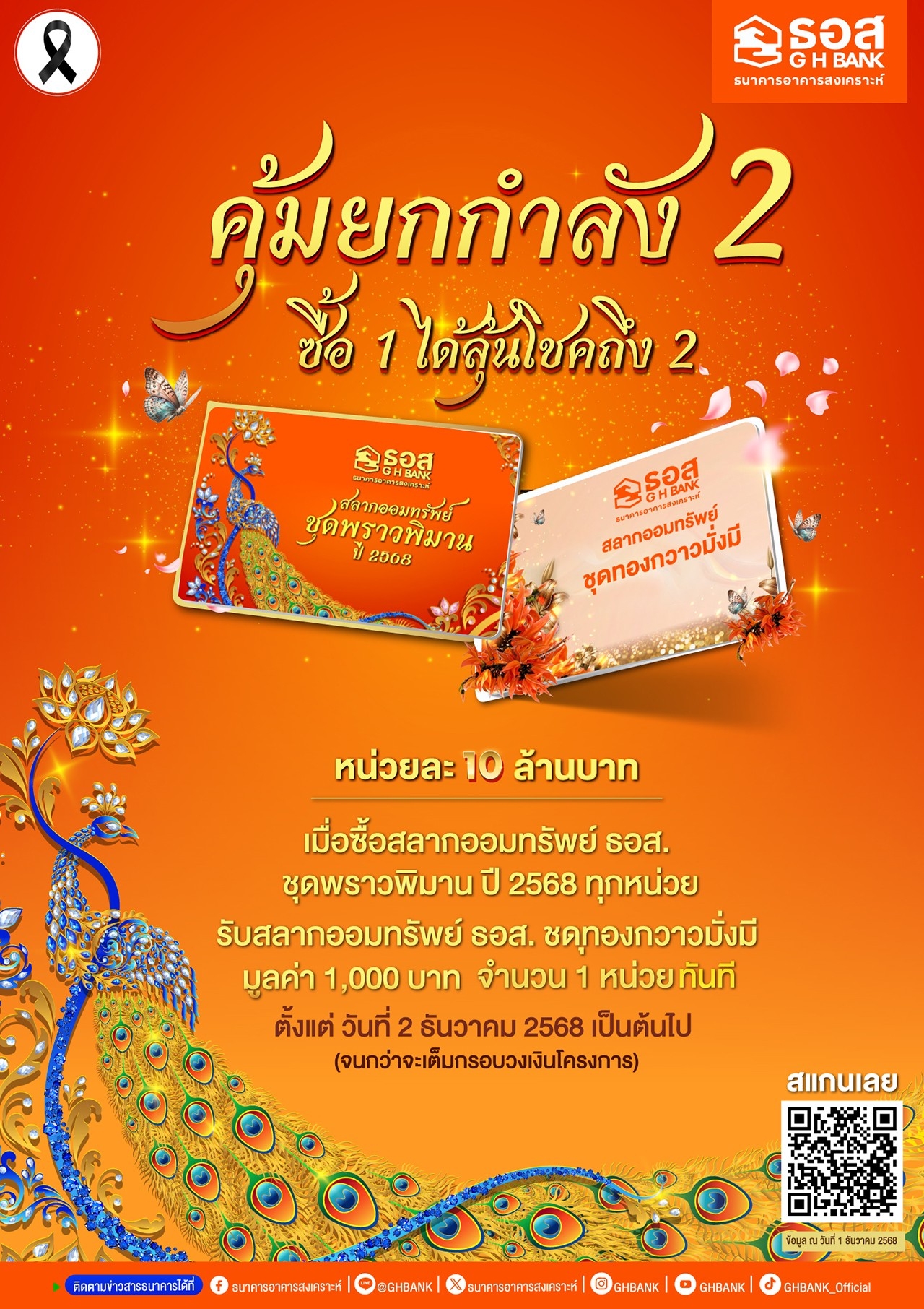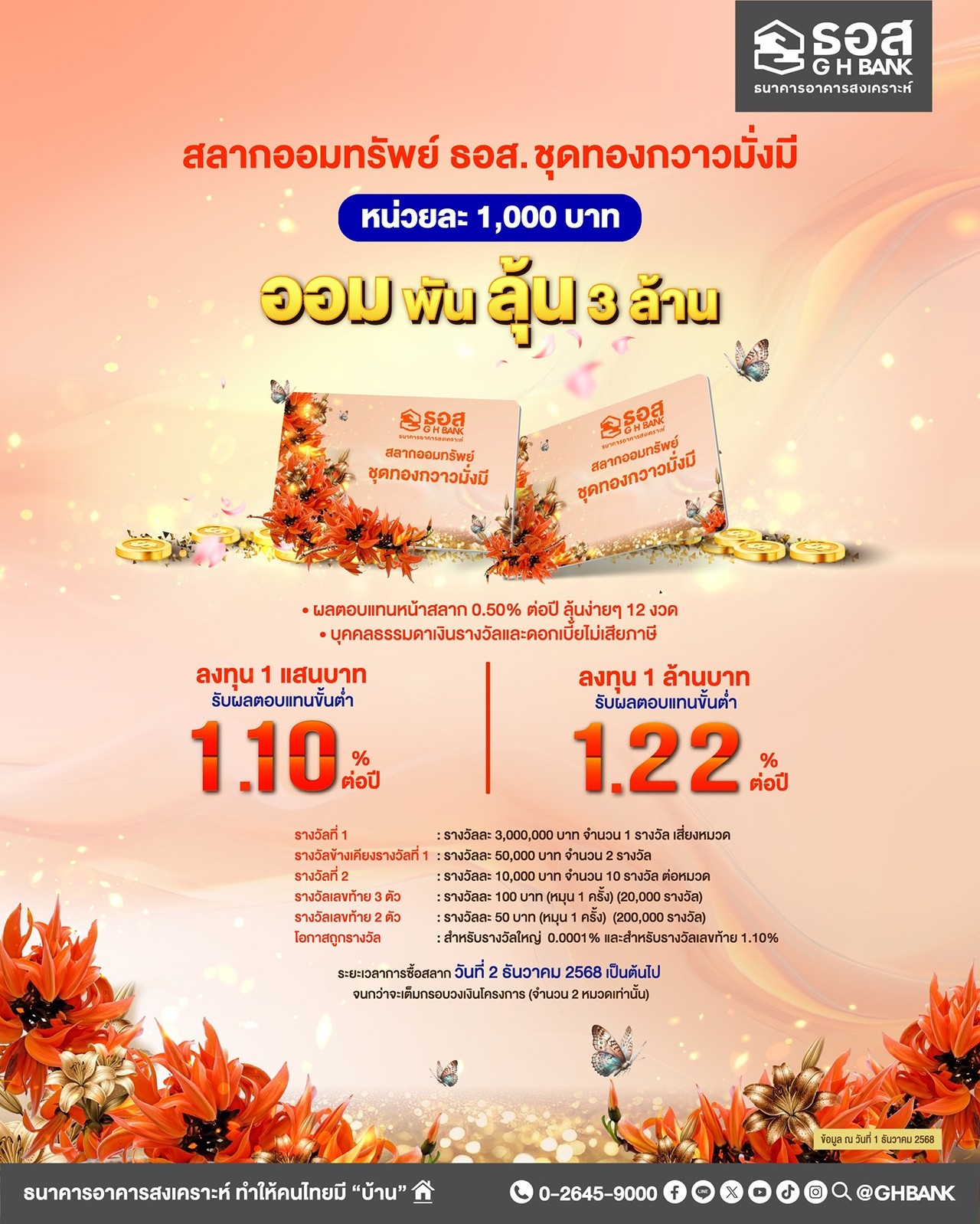 มีโอกาสถูกรางวัลใหญ่ 1.30% และมีโอกาสถูกรางวัลเลขท้ายสูงถึง 10% พิเศษ! ผู้ที่ซื้อสลากออมทรัพย์ ธอส. ชุดพราวพิมาน ปี 2568 ตั้งแต่วันที่ 2 ธันวาคม 2568 เป็นต้นไป รับฟรีสลากออมทรัพย์ ธอส. ชุดทองกวาวมั่งมี จำนวน 1 หน่วย มูลค่า 1,000 บาท
