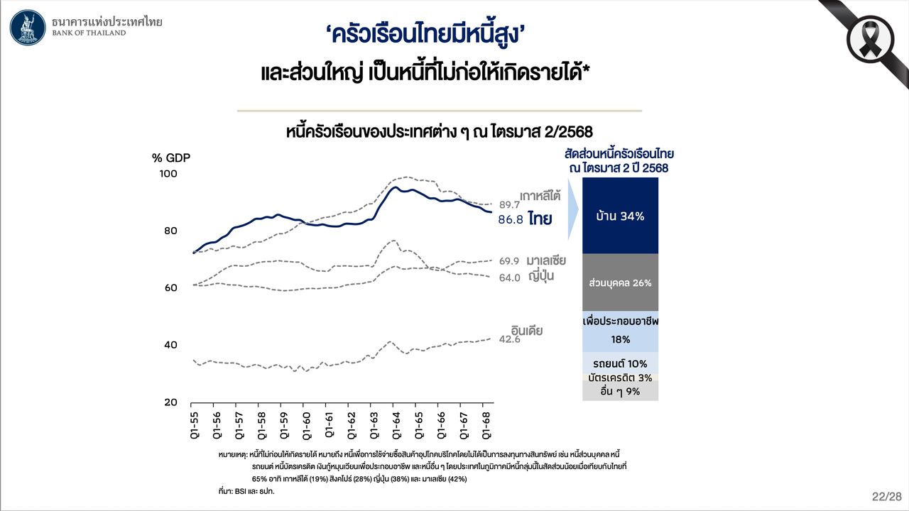 ชญาวดี ชัยอนันต์ ผู้ช่วยผู้ว่าการ สายองค์กรสัมพันธ์ และโฆษกธนาคารแห่งประเทศไทย (ธปท.) กางตัวเลขให้เห็นภาพชัดๆ ว่า คนไทยมีรายได้น้อยกว่ารายจ่ายมาตลอด อย่างปี 2566 ที่ผ่านมา ครัวเรือนไทยมีค่าเฉลี่ยรายจ่ายอยู่ที่ 18,691 บาทต่อเดือน ในขณะที่รายรับอยู่ที่ 16,817 บาทต่อเดือนเท่านั้น