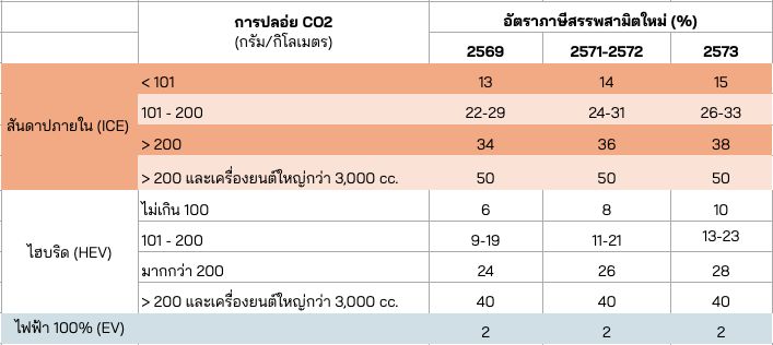ที่สำคัญคือโครงสร้างภาษีสรรพสามิตรถยนต์ใหม่จะมีการปรับขึ้นอีก 2 ครั้ง คือปี 2571-2572 และ ปี 2573 มีเพียงรถยนต์ไฟฟ้า (EV) ที่ภาษีใหม่นี้จะยังคงอยู่ระดับต่ำที่ 2% (จากก่อนหน้าที่เคยอยู่ราว 8%)