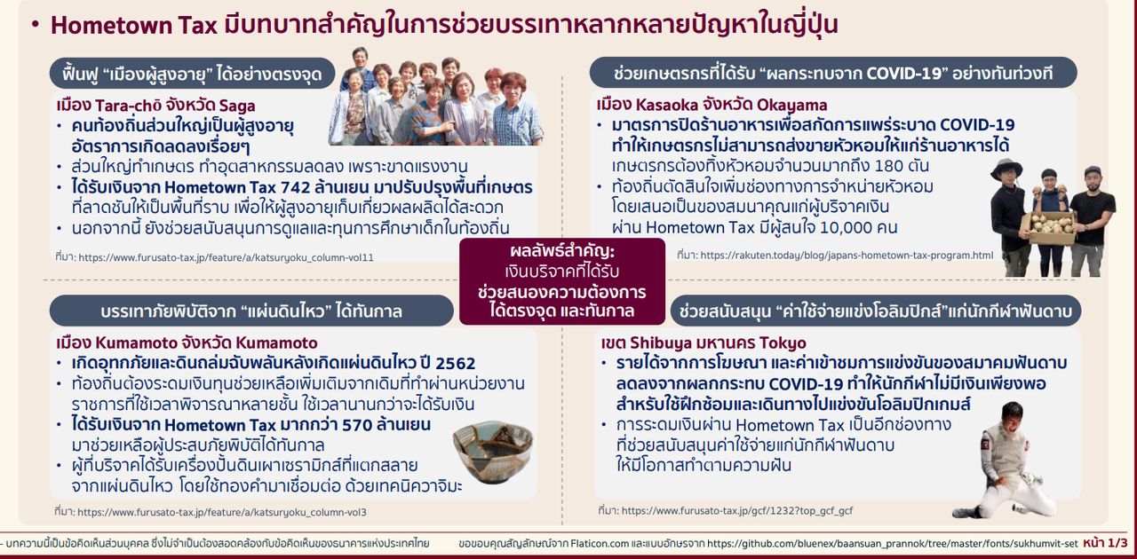 ญี่ปุ่นเริ่มใช้ระบบนี้ในปี 2551 ภายใต้ชื่อ "Furusato Nozei" เพื่อให้พลเมืองมีส่วนร่วมฟื้นฟูบ้านเกิด โดยมีกุญแจความสำเร็จที่ไทยสามารถนำมาประยุกต์ใช้ได้ 3 ด้านหลัก