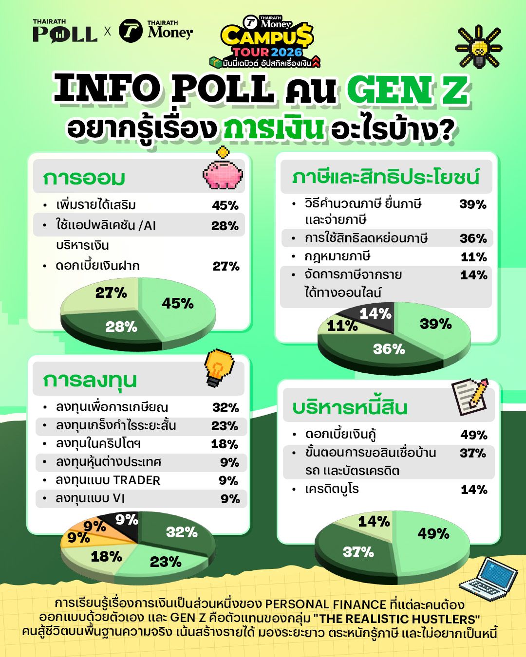 Thairath Money ทำการสำรวจโพลในหัวข้อ “เรื่องการเงินที่ Gen Z อยากรู้” ผ่านเว็บไซต์และช่องทางออนไลน์ของไทยรัฐ เพื่อสำรวจความคิดเห็นของคนรุ่นใหม่ที่สนใจเรียนรู้เรื่องการเงิน
