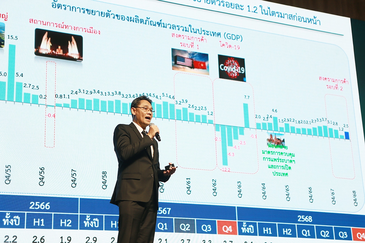ต่อมาใน Session 1 ดนุชา พิชยนันท์ เลขาธิการ สำนักงานสภาพัฒนาการเศรษฐกิจและสังคมแห่งชาติ (สภาพัฒน์) ได้ร่วมฉายมุมมองในหัวข้อ โครงสร้างเศรษฐกิจไทย ว่า ภาพรวมอัตราการเติบโตของเศรษฐกิจ (GDP) ไทย ในช่วงไตรมาสที่ 4 ของปี 2568 แสดงให้เห็นถึงการขยายตัวที่ "ดีกว่าคาด" โดยเติบโตถึง 2.5% (เทียบกับช่วงเดียวกันของปี 67) ส่งผลให้ภาพรวมทั้งปีอยู่ที่ 2.4% แม้ก่อนหน้านี้หลายสำนักจะคาดการณ์ไว้เพียง 1.9 - 2% เท่านั้น แรงขับเคลื่อนสำคัญมาจาก 3 ปัจจัยหลัก ได้แก่