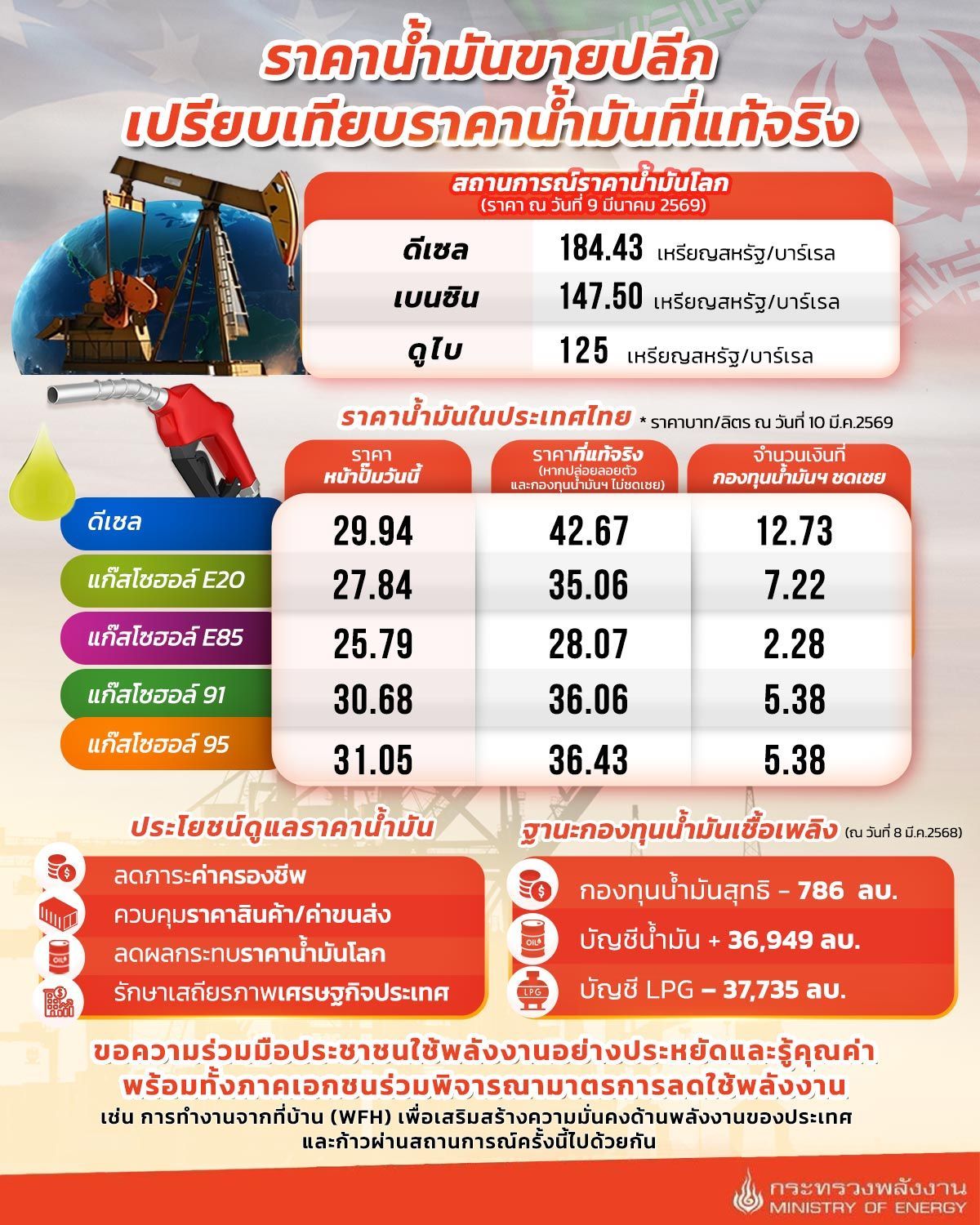 ขณะเดียวกันฐานะล่าสุดของกองทุนน้ำมันเชื้อเพลิงยังคง ติดลบสุทธิราว 786 ล้านบาท แม้ว่าบัญชีน้ำมันจะเป็นบวกกว่า 36,949 ล้านบาท แต่บัญชี LPG ยังติดลบกว่า 37,735 ล้านบาท