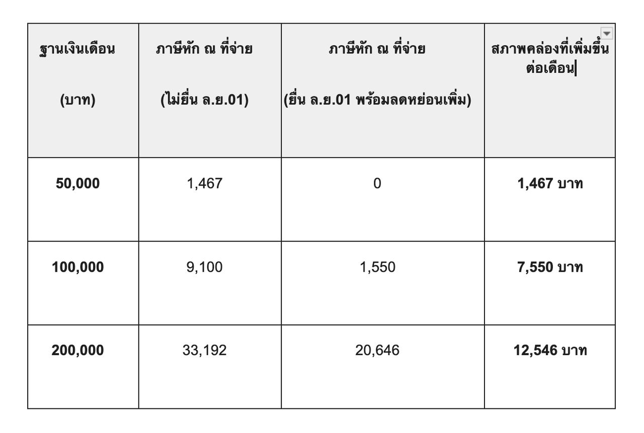 โดยหนึ่งในยุทธศาสตร์สำคัญ ที่หลายคนอาจมองข้ามไป คือ การบริหารจัดการ "กระแสเงินสด" ขณะในแง่การวางแผนภาษีนั้น ก็สามารถทำได้ ผ่านแบบฟอร์มที่ชื่อว่า ล.ย.01 ซึ่งเป็นกุญแจสำคัญที่จะช่วยให้เรามีเงินเหลือใช้ในกระเป๋าเพิ่มขึ้นในแต่ละเดือน โดยไม่ต้องรอขอคืนภาษีในช่วงต้นปีถัดไป