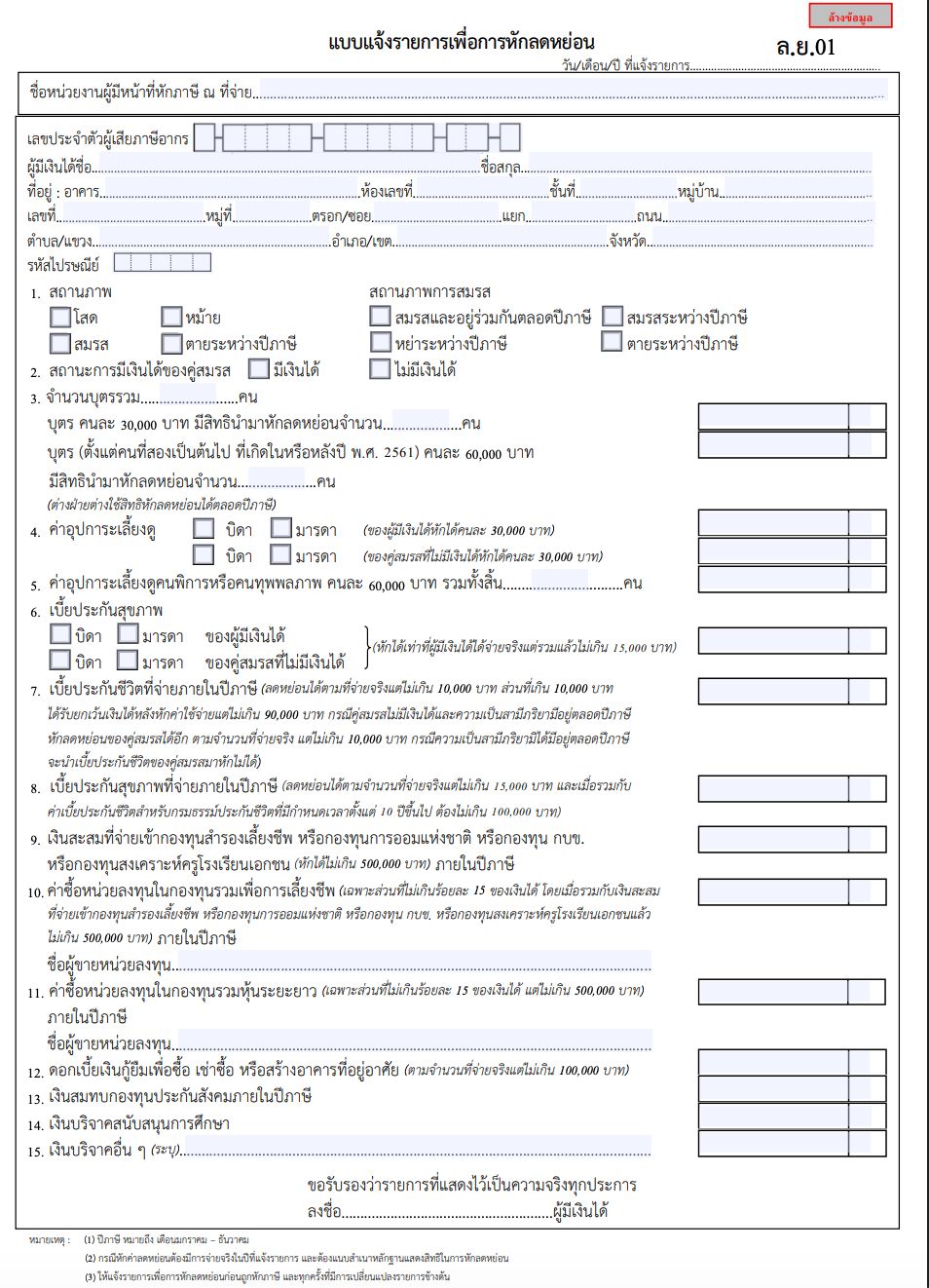ตามหลักการ แม้พนักงานควรกรอกแบบ ล.ย.01 ให้เสร็จสิ้นภายในเดือนมกราคมของทุกปี แต่เราสามารถทำแบบ ล.ย.01 ฉบับปรับปรุงใหม่ยื่นให้ฝ่ายบุคคลได้เสมอ เมื่อมีการเปลี่ยนแปลงรายการลดหย่อนที่มีนัยสำคัญ เช่น ตามรายละเอียดสำคัญดังนี้
