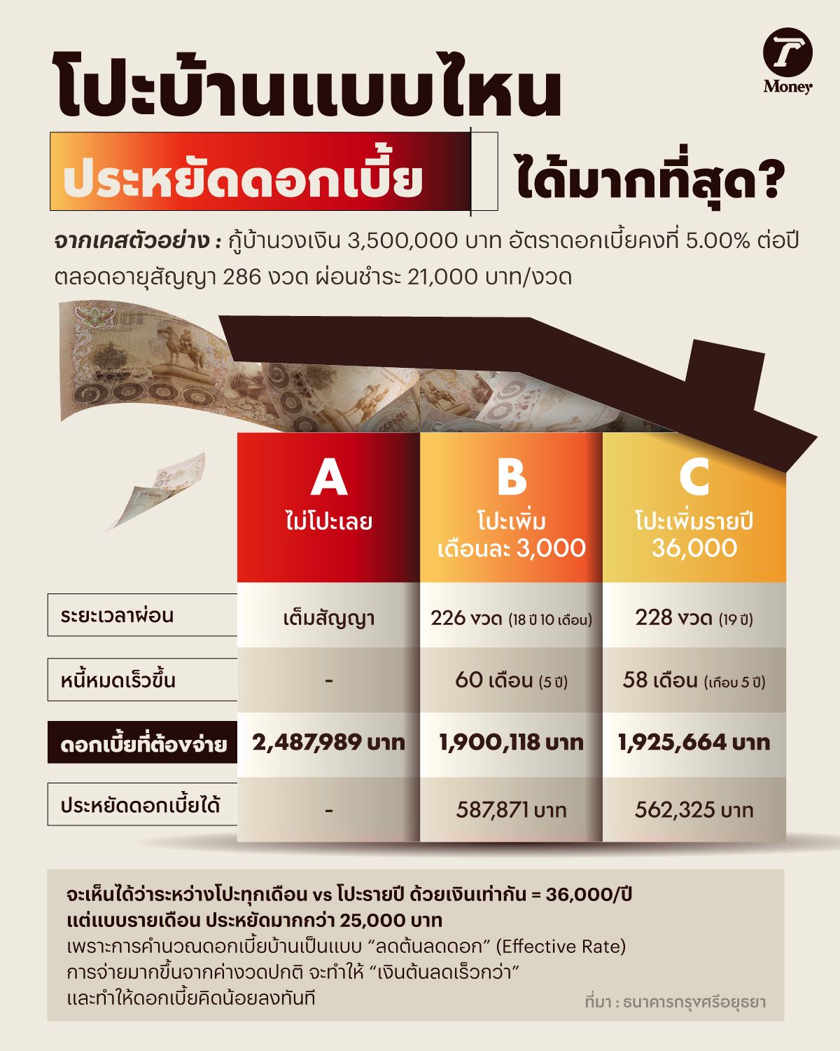 จากตารางจะเห็นว่า แม้จะใช้จำนวนเงินรวมต่อปีเท่ากันคือ 36,000 บาท แต่การ โปะเพิ่มเดือนละ 3,000 บาท (แบบ B) สามารถประหยัดดอกเบี้ยได้มากกว่าการโปะปีละครั้งถึง 25,546 บาท และยังทำให้หนี้หมดเร็วกว่าเดิมอีกประมาณ 2 งวด