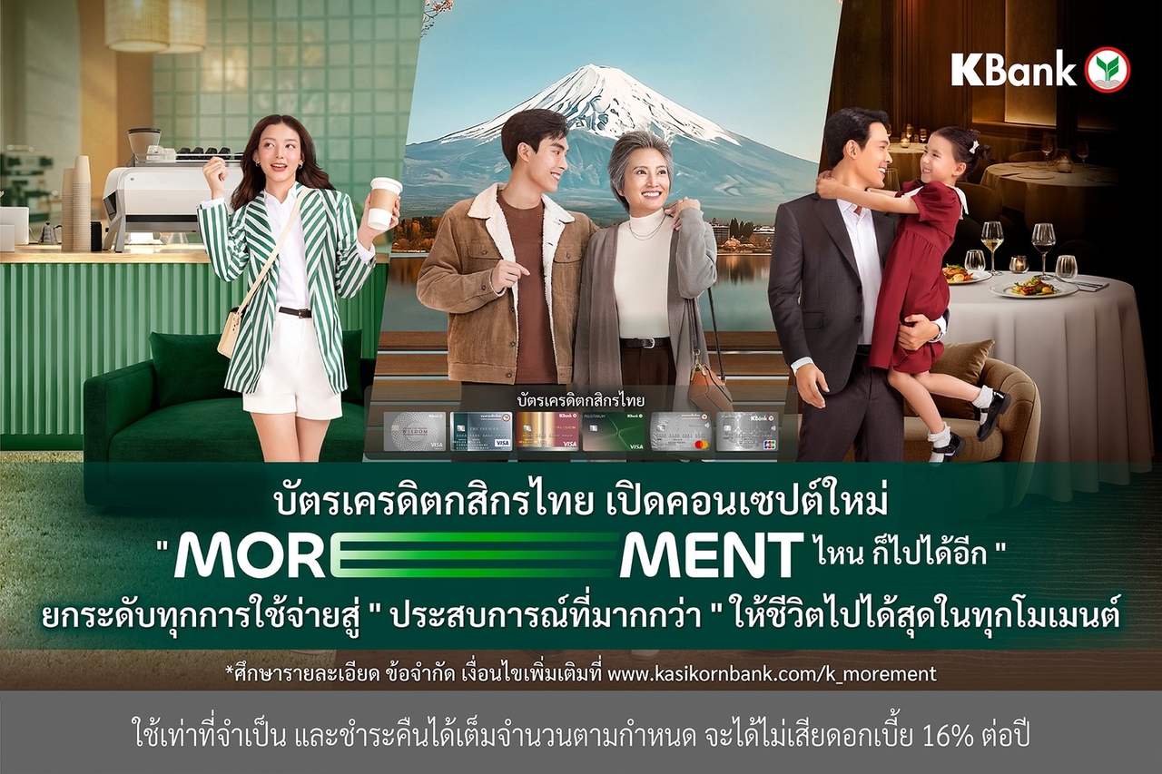 บัตรเครดิตกสิกรไทยตอกย้ำภาพลักษณ์บัตรเครดิตยุคใหม่ เดินหน้าขับเคลื่อนแบรนด์สู่การเป็น “มากกว่าการใช้จ่าย” ผ่านแนวคิด “MOREMENT ไหน ก็ไปได้อีก” เพื่อตอบรับพฤติกรรมผู้บริโภคยุค Value-First ที่ให้ความสำคัญทั้งความคุ้มค่าและคุณภาพของประสบการณ์ กสิกรไทยจึงยกระดับบทบาทของบัตรเครดิต จากเครื่องมือทางการเงิน สู่ “ตัวช่วยในการสร้างประสบการณ์ชีวิต” ด้วยการออกแบบบัตรที่หลากหลาย พร้อมสิทธิประโยชน์ที่ตอบโจทย์ลูกค้าในทุกเซ็กเมนต์ ครอบคลุมไลฟ์สไตล์ต่างๆ ในทุกโมเมนต์ของชีวิต ไม่ว่าจะเป็นดีลคุ้มสำหรับการช้อปออนไลน์ การสะสมและแลกคะแนนสะสมเพื่อรับรางวัลและประสบการณ์พิเศษผ่าน K PLUS รวมถึงโอกาสในการเข้าถึงประสบการณ์ไลฟ์สไตล์ระดับเวิลด์คลาส