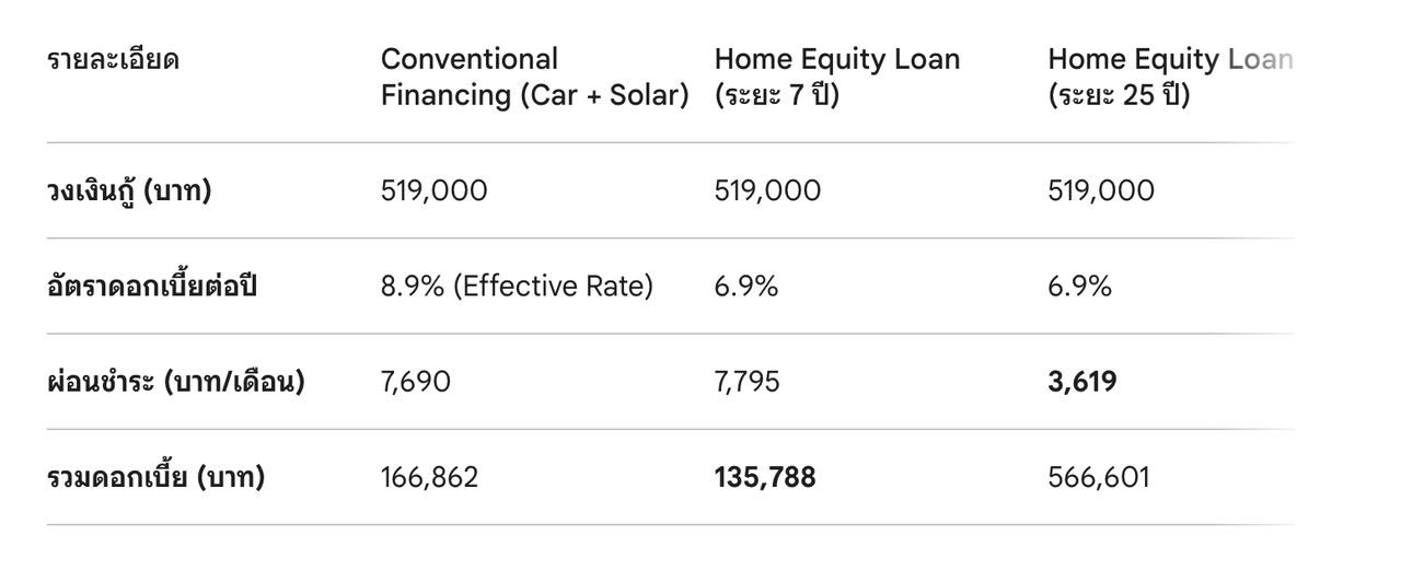 ดร.ยุ้ย เปิดเผยว่า จากการเปรียบเทียบข้อมูลการเงินพบว่า การใช้สินเชื่อที่อยู่อาศัย (Home Equity Loan) มาบริหารจัดการเป็นทางเลือกที่น่าสนใจสำหรับการวางแผนการเงินส่วนบุคคล ดังนี้
