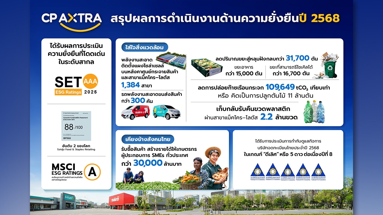 บริษัท ซีพี แอ็กซ์ตร้า จำกัด (มหาชน) หรือ CP AXTRA ผู้ดำเนินธุรกิจค้าส่งค้าปลีก “แม็คโคร-โลตัส” ตอกย้ำความเป็นผู้นำด้านความยั่งยืนของกลุ่มธุรกิจค้าปลีกค้าส่งไทย จากผลการดำเนินงานด้านความยั่งยืน ปี 2568 ที่ได้รับการยอมรับในระดับสากล โดยบริษัทฯ ได้รับการประเมิน SET ESG Ratings ระดับ “AAA” ซึ่งเป็นระดับสูงสุด ควบคู่กับ MSCI ESG Rating ระดับ “A” และคะแนน S&P Global Corporate Sustainability Assessment (CSA) 88/100 คะแนน สูงเป็นอันดับ 2 ของโลก ในกลุ่มอุตสาหกรรม Food & Staples Retailing สะท้อนความมุ่งมั่นในการดำเนินธุรกิจอย่างยั่งยืนที่เห็นผลเป็นรูปธรรม ครอบคลุมทั้งด้านสิ่งแวดล้อม สังคม และธรรมาภิบาล