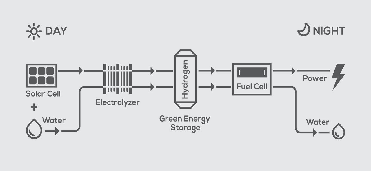 ซึ่งไฮโดรเจนที่ได้จะเป็น Green Hydrogen เพราะผลิตจากแหล่งพลังงานหมุนเวียน อย่างพลังงานแสงอาทิตย์ และระบบนี้จะไม่มีการปล่อยของเสียหรือก๊าซคาร์บอนไดออกไซด์ออกมาเลย ซึ่งในเวลากลางคืนหรือช่วงที่มีแสงแดดน้อย ไฮโดรเจนที่เก็บไว้จะถูกแปลงกลับเป็นกระแสไฟฟ้าโดยใช้ระบบเซลล์เชื้อเพลิงไฮโดรเจน (Fuel Cell) เมื่อไฮโดรเจนรวมกับออกซิเจน ก็จะเป็นไฟฟ้ากับน้ำ ซึ่งไม่ส่งผลกระทบต่อสภาพแวดล้อม ทำให้มั่นใจได้ว่ามีการใช้พลังงานที่สะอาดและเป็นมิตรกับสิ่งแวดล้อมอย่างสมบูรณ์