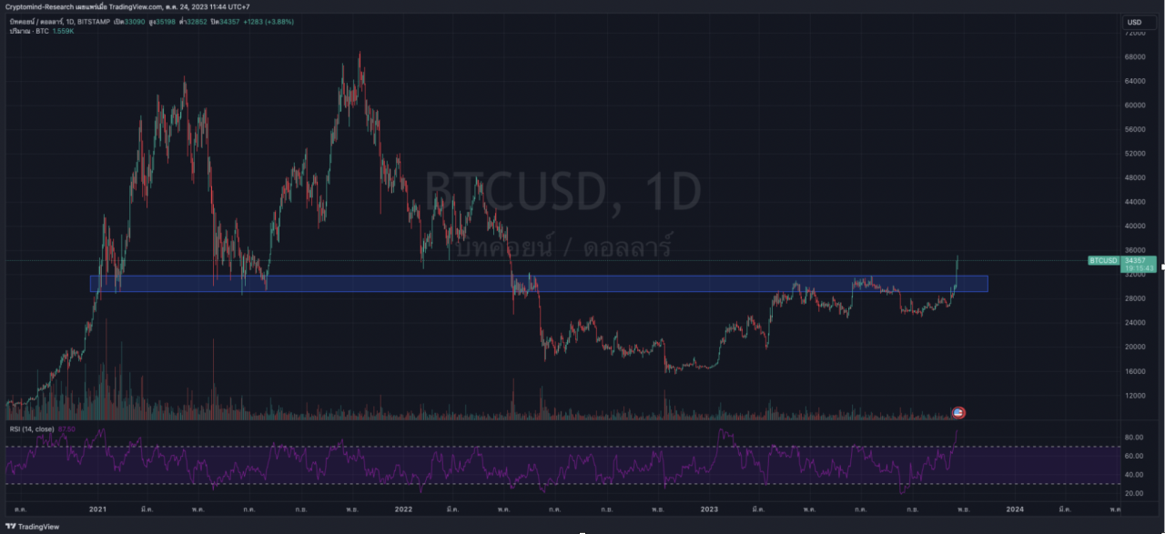 ในช่วง 24 ชั่วโมงที่ผ่านมา ราคา Bitcoin ได้มีการปรับตัวขึ้นอย่างรุนแรงกว่า 15% ไปแตะที่ราคาราวๆ 35,000 ดอลลาร์ เป็นที่เรียบร้อยแล้ว โดยการปรับตัวของราคาดังกล่าวนั้นยังเป็นการทะลุ แนวรับ/แนวต้าน สำคัญที่ช่วง 29,000 - 31,000 ดอลลาร์ ได้อย่างมีนัยสำคัญ