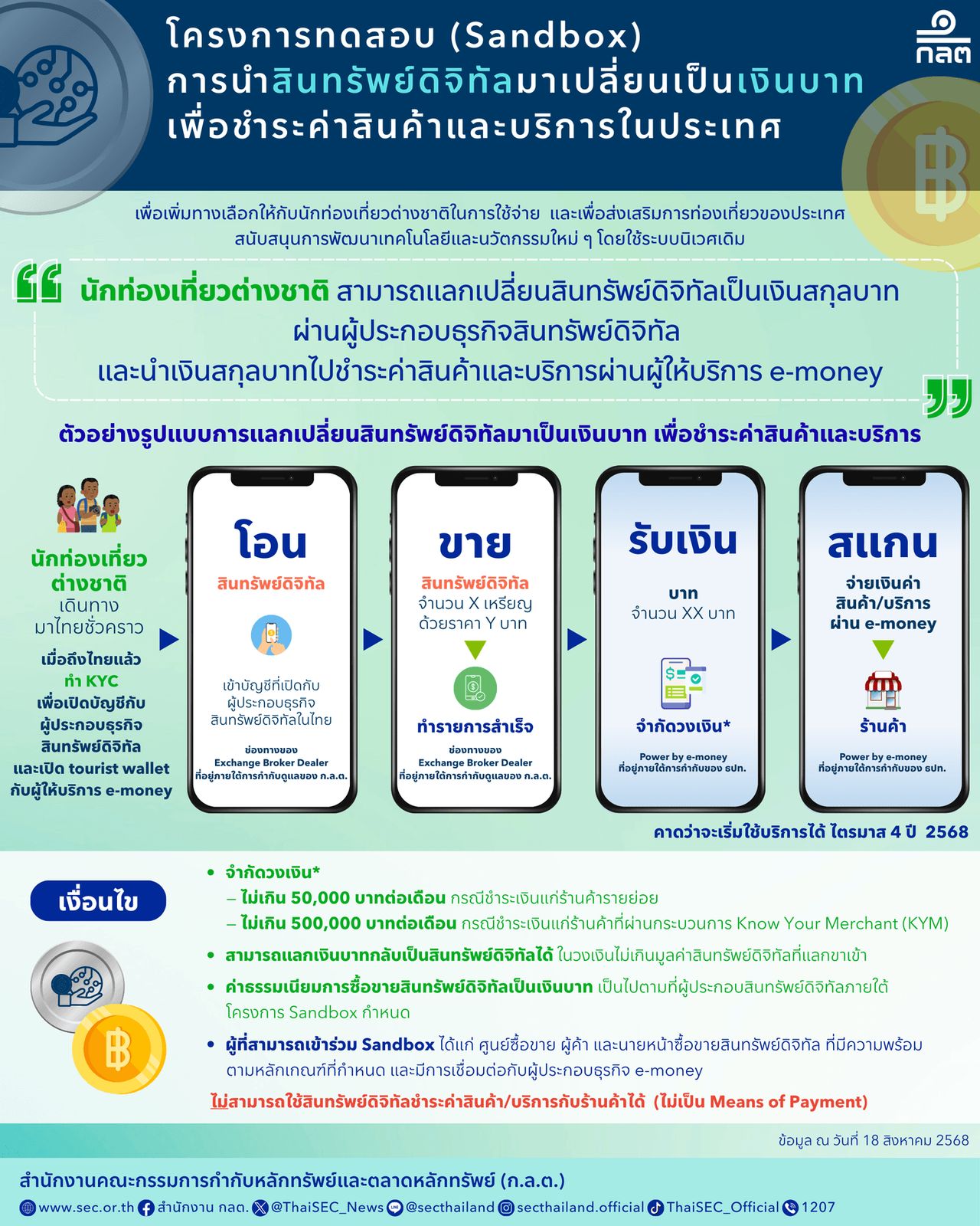 ในช่วงที่ผ่านมา มีประกาศออกมาต่อเนื่องว่า สำนักงานคณะกรรมการกำกับหลักทรัพย์และตลาดหลักทรัพย์ (ก.ล.ต.) ได้เตรียมเปิดตัว Sandbox ที่ให้นักท่องเที่ยวต่างชาติสามารถแลกสินทรัพย์ดิจิทัล (Digital Asset) เป็นเงินบาท เพื่อที่จะนำมาใช้จ่ายในระหว่างการท่องเที่ยวในประเทศไทย ทั้งนี้เล็งเห็นว่าเป็นแนวทางที่จะช่วยกระตุ้นเศรษฐกิจและสนับสนุนอุตสาหกรรมท่องเที่ยวให้คึกคักต่อเนื่อง