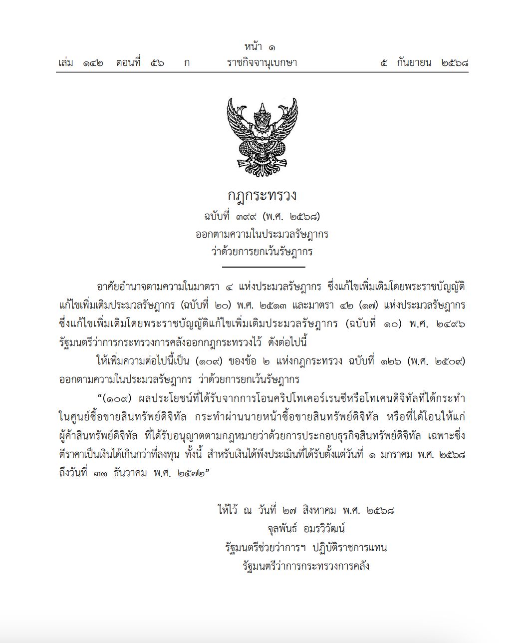 ลงนาม จุลพันธ์ อมรวิวัฒน์ รัฐมนตรีช่วยว่าการฯ ปฏิบัติราชการแทน รัฐมนตรีว่าการกระทรวงการคลัง เมื่อวันที่ 27 สิงหาคม พ.ศ. 2568