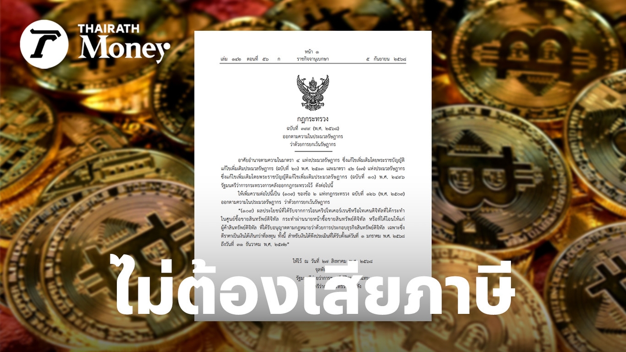 ราชกิจจานุเบกษา ประกาศกฎกระทรวงใหม่ ยกเว้นภาษีเงินได้จากการทำกำไรจากการเทรดคริปโตฯ ที่ทำผ่านศูนย์ซื้อขายที่ได้รับอนุญาตในประเทศไทย เป็นมาตรการส่งเสริมให้การลงทุนในสินทรัพย์ดิจิทัลโปร่งใสและอยู่ในระบบที่รัฐสามารถกำกับดูแลได้