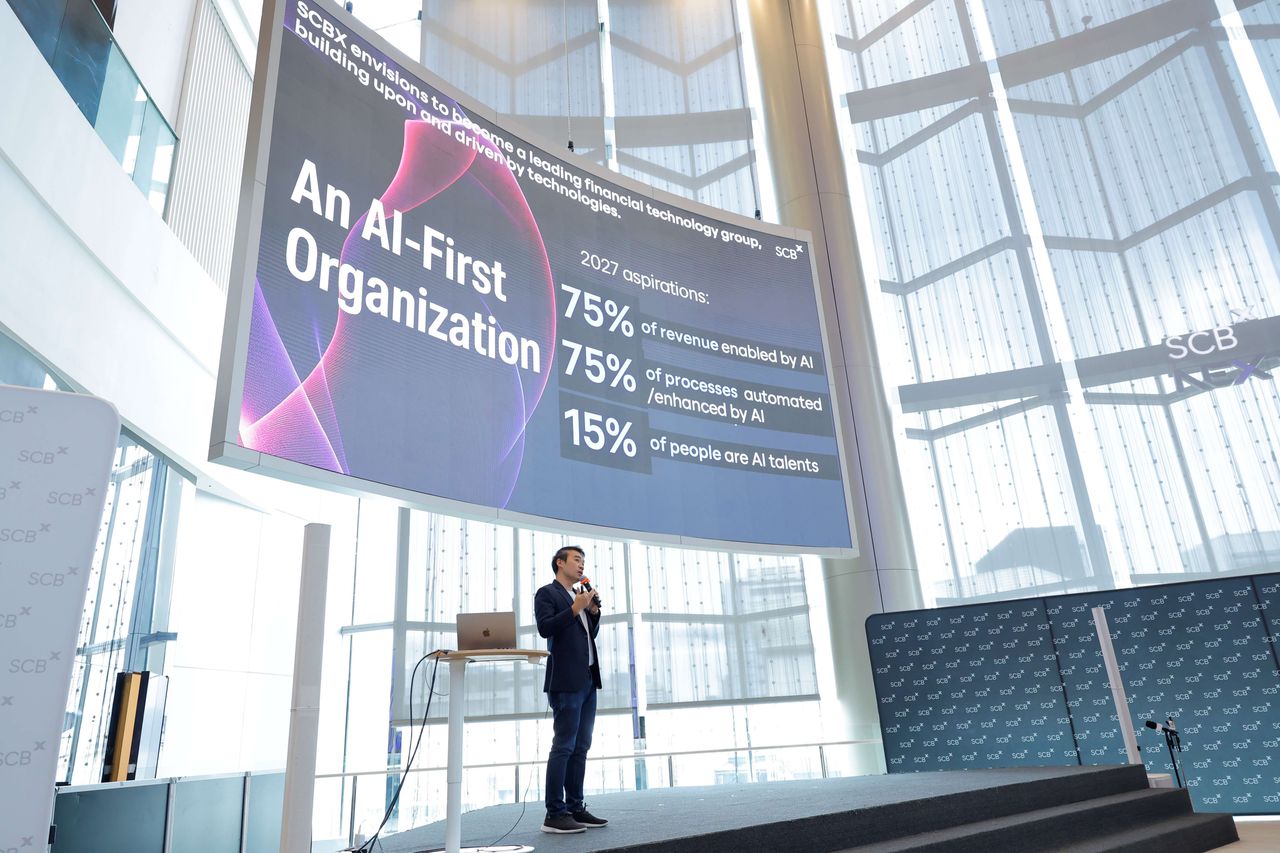 กวีวุฒิ เต็มภูวภัทร Chief Innovation Officer บริษัท เอสซีบี เอกซ์ จำกัด (มหาชน) หรือ SCBX ขึ้นกล่าวบนเวทีเปิดตัวสมุดปกขาวถึงการเปลี่ยนผ่านองค์กรสู่ AI-First Organization ด้วยการสร้าง AI Innovation Ecosystem ภายใต้การทำงานของ 3 ส่วนหลัก คือ SCBX ในการขับเคลื่อนวิสัยทัศน์ SCB10X วางโครงสร้างพื้นฐาน และ DataX สเกลพร้อมวางตลาด โดยตั้งเป้าหมายภายในปี 2027 ว่า