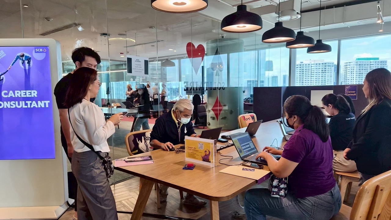 แม้องค์กรต้องปรับตัวขนานใหญ่ แต่อนาคตของพนักงานต้องไม่ถูกทิ้งไว้ข้างหลัง เพราะ “คน” คือหัวใจของการเติบโตอย่างยั่งยืน SCB ยึดหลัก “People-first” เรามีโครงการสำคัญอย่าง “SCB Be With You” เพื่อส่งคนให้ถึงฝั่ง ด้วยการเตรียมทักษะ, การแนะแนวอาชีพ, การเชื่อมโยงงานกับพันธมิตร และเปิดโอกาสการทำงานในรูปแบบใหม่