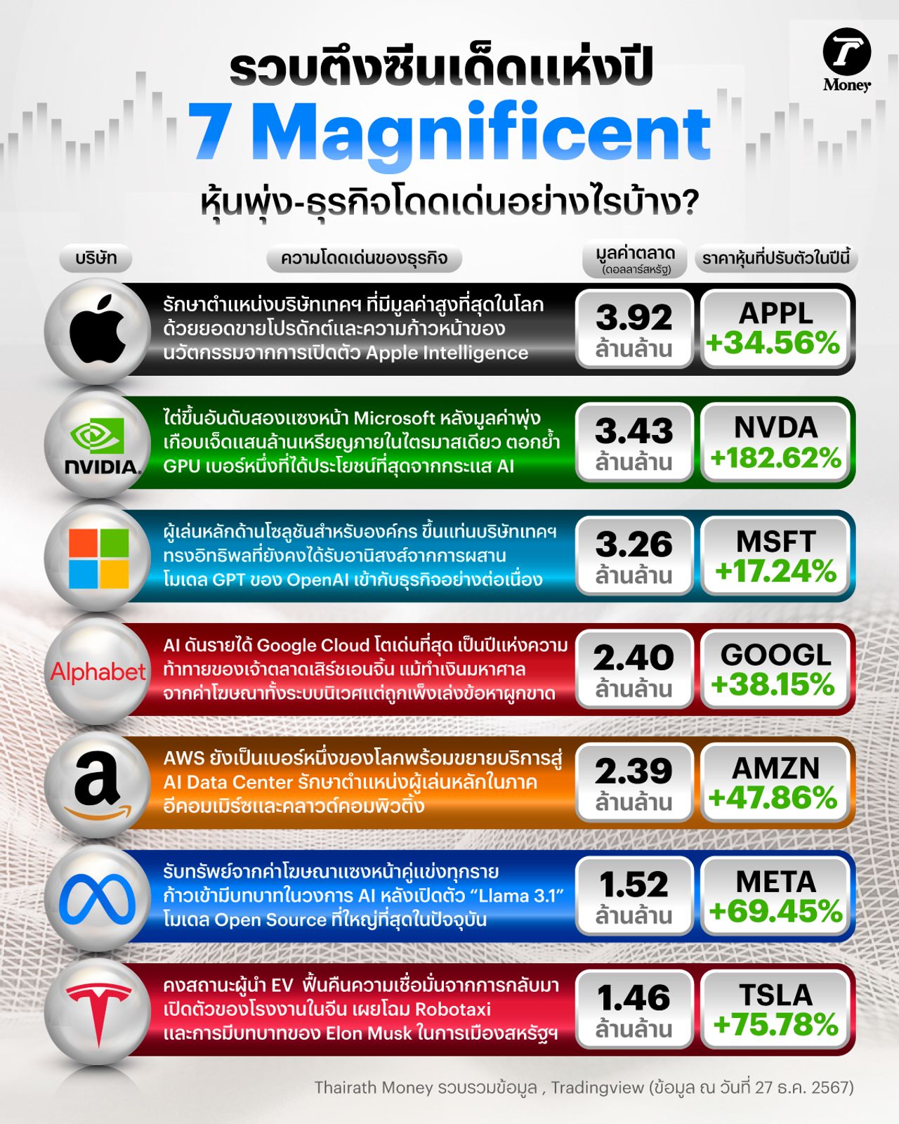 โดยปัจจุบัน “7 Magnificent” มีสัดส่วนรวมเกือบ 35% ของมูลค่าหลักทรัพย์ตามราคาตลาดทั้งหมดของ S&P 500 ณ เดือนธันวาคม 2024 โดยหุ้นที่มีการปรับตัวขึ้นสูงสุดในกลุ่มนี้คือ Nvidia, Tesla และ Amazon