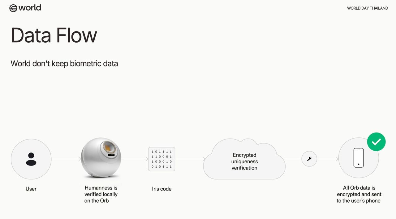มาถึงตรงนี้หลายคนอาจสงสัยว่า เราจะไว้ใจ World ได้อย่างไรว่า หลังสแกนม่านตาแล้วจะไม่เก็บข้อมูลเราไว้ อธิบายแบบนี้ คือ หัวใจสำคัญของ World คือการออกแบบมาเพื่อยืนยันว่าคุณเป็น "คนจริง" โดยไม่ต้องรู้ว่าคุณคือใคร จากที่เห็นใน Data Flow ที่ทาง World ได้แสดงให้เราเห็นนั้น เวลาเราสแกนใบหน้าและม่านตาผ่านเครื่อง Orb ระบบจะสร้างรหัสลับที่เป็นแค่ "ชุดตัวเลข" ซึ่งไม่สามารถย้อนกลับมาเป็นภาพได้ จากนั้นภาพที่สแกนจะถูกลบออกจากเครื่องทันที ไม่มีการเก็บไว้ที่ไหนเลย และแม้แต่ทีม World เองไม่สามารถรู้ได้ว่ารหัสนั้นเป็นของใคร