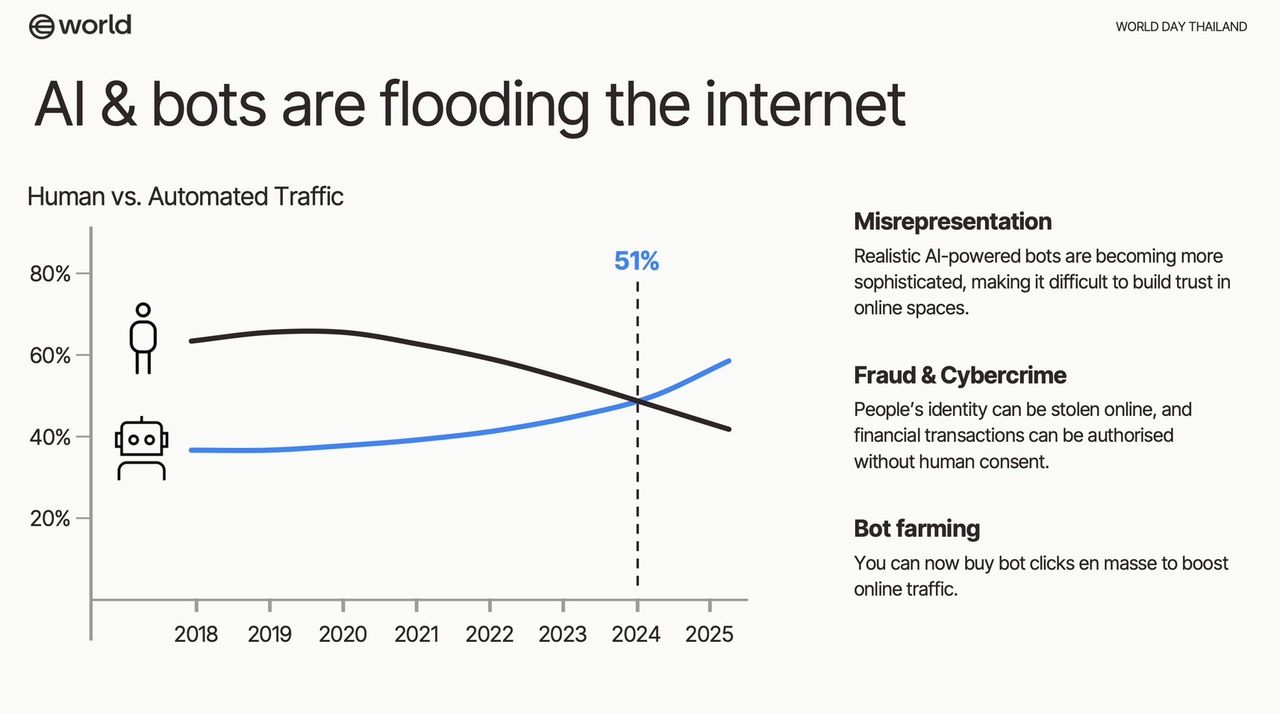 ทุกคนรู้ไหมว่า...ทุกวันนี้ในโลกอินเทอร์เน็ตที่เราใช้กันอยู่ทุกวันนี้ AI และบอตกำลังครองโลกออนไลน์มากกว่าที่เราคิด ซึ่งแฝงตัวอย่างแนบเนียน นับตั้งแต่ปี 2024 ปริมาณการใช้งานอินเทอร์เน็ตจากมนุษย์จริงลดลงอย่างรวดเร็วจในขณะที่ AI และบอตต่าง ๆ กลับเพิ่มขึ้น กล่าวคือ มากกว่าครึ่งของการใช้งานอินเทอร์เน็ตทั่วโลกจะมาจากสิ่งที่ไม่ใช่ “มนุษย์” อีกต่อไป