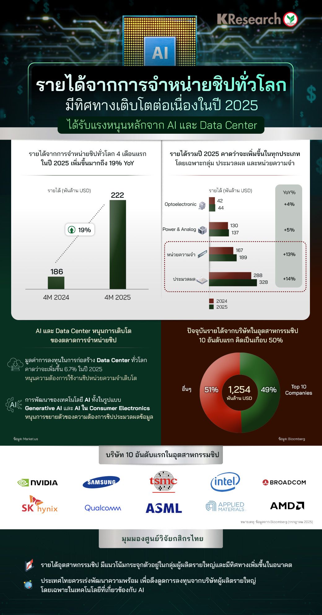 จากรายงานของ KResearch อ้างอิงข้อมูลจาก Market.us และ Bloomberg พบว่า รายได้จากการจำหน่ายชิปทั่วโลกในช่วง 4 เดือนแรกของปี 2025 เพิ่มขึ้นถึง 19% เมื่อเทียบกับช่วงเดียวกันของปีก่อนหน้า โดยแตะระดับ 2.22 แสนล้านดอลลาร์สหรัฐ จากเดิม 1.86 แสนล้านดอลลาร์สหรัฐ สะท้อนถึงความต้องการใช้ชิปในหลากหลายภาคส่วนที่ยังคงอยู่ในระดับสูง