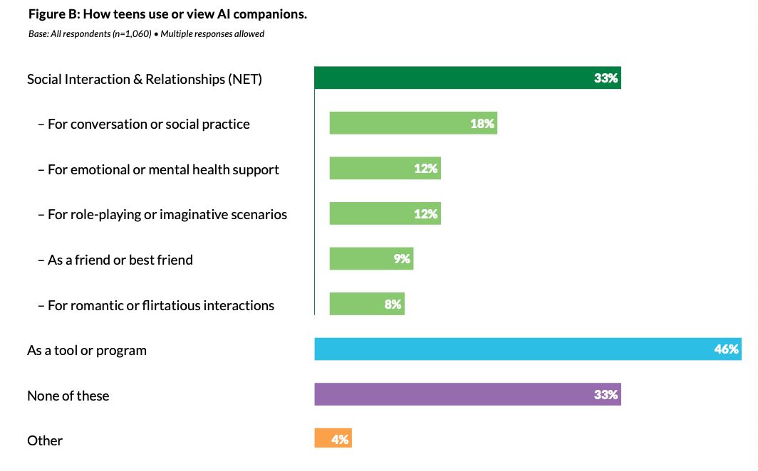 งานวิจัยนี้สะท้อนภาพที่ซับซ้อนของพฤติกรรมการใช้ AI คู่สนทนาในหมู่วัยรุ่น ซึ่งท้าทายทั้งมุมมองในแง่ดีและแง่ร้ายสุดโต่งเกี่ยวกับเทคโนโลยีนี้ และยังมีข้อกังวลที่นำไปสู่การวางแนวทางการใช้งานที่เหมาะสม เพราะผู้ใช้วัยรุ่นกว่า 30% เลือกพูดคุยเรื่องจริงจังกับ AI แทนมนุษย์ และกว่า 20% ที่เคยเปิดเผยข้อมูลส่วนตัวกับ AI เช่น ชื่อจริง ตำแหน่งที่อยู่ หรือความลับของตนเองกับแพลตฟอร์มเหล่านี้ โดยไม่รู้เลยว่าบริษัทมีสิทธิ์อันกว้างขวางเหนือข้อมูลที่ผู้ใช้สร้างขึ้น สิ่งเหล่านี้สะท้อนถึงรูปแบบการใช้งานที่น่าเป็นห่วงในกลุ่มวัยรุ่นจำนวนไม่น้อย