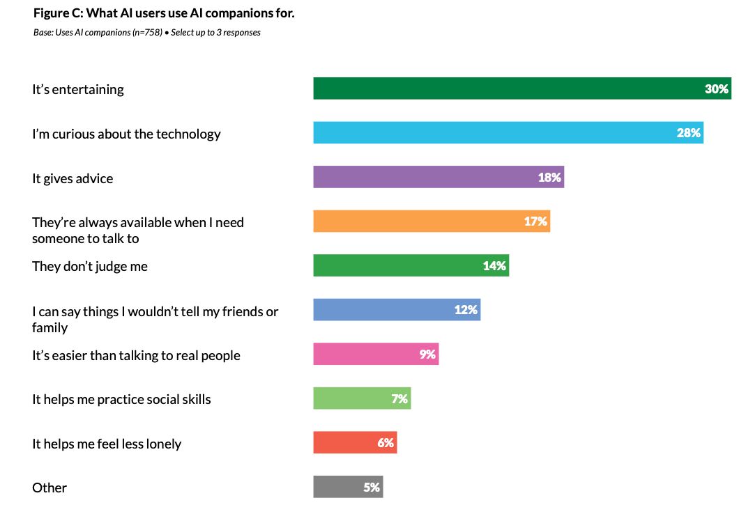 มากไปกว่านั้นแม้การใช้ AI companions ส่วนใหญ่มุ่งที่ความบันเทิงและความอยากรู้ แต่มีสัดส่วนไม่น้อยที่พึ่งพา AI ทางอารมณ์หรือใช้เพื่อจัดการกับความเหงาและความโดดเดี่ยว บางรายเกิดการพึ่งพาทางอารมณ์อย่างหนักถึงขั้นรู้สึกไม่มั่นคงเมื่อ AI ไม่ตอบกลับหรือเกิดความผูกพันเกินขอบเขต
