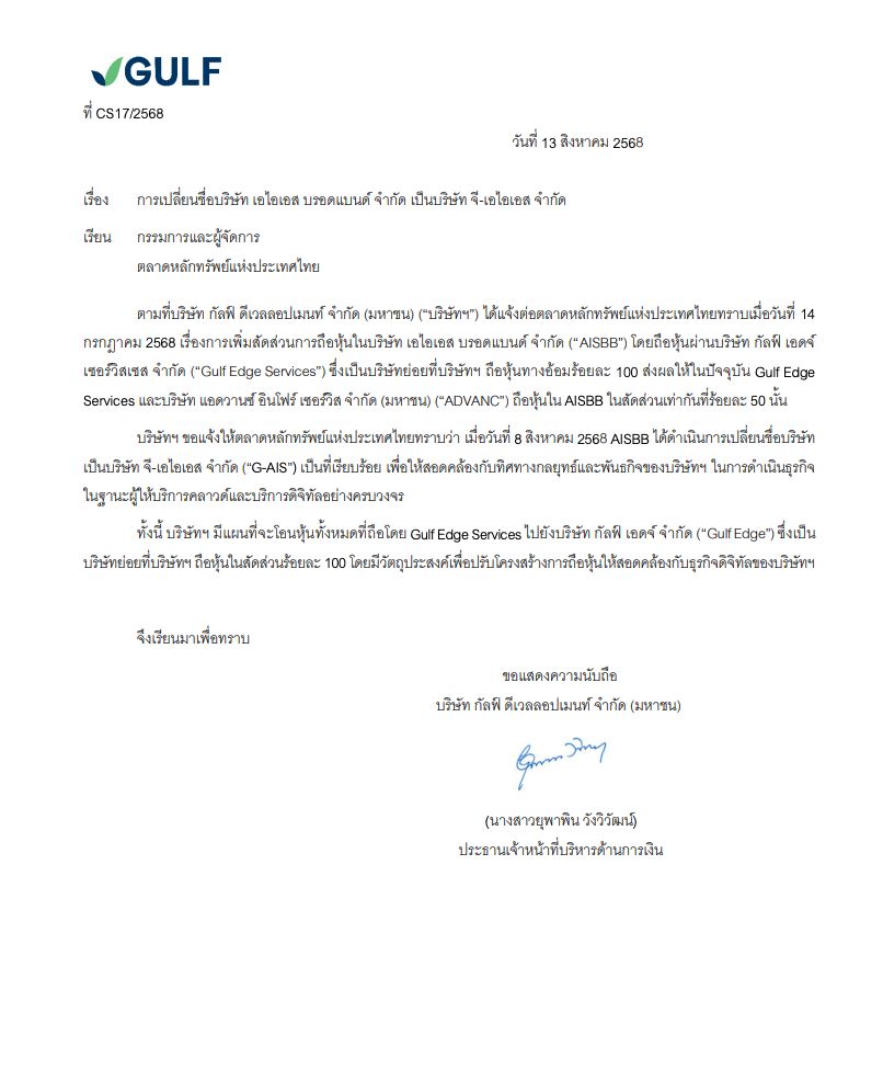 บริษัท กัลฟ์ ดีเวลลอปเมนท์ จำกัด (มหาชน) หรือ GULF อัปเดตความคืบหน้าหลังจากเมื่อ 14 กรกฎาคม 2568 บริษัทได้เพิ่มสัดส่วนการถือหุ้นใน AIS Broadband (AISBB) ผ่านบริษัทย่อย Gulf Edge Services ซึ่ง GULF ถือหุ้นทางอ้อม 100% จนปัจจุบัน Gulf Edge Services และ แอดวานซ์ อินโฟร์ เซอร์วิส (ADVANC) ถือหุ้นใน AISBB ฝั่งละ 50% เท่ากัน