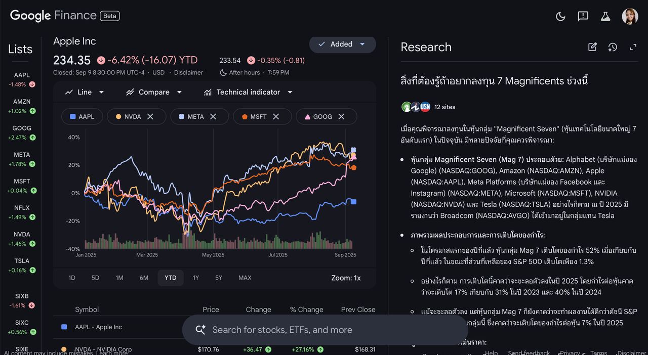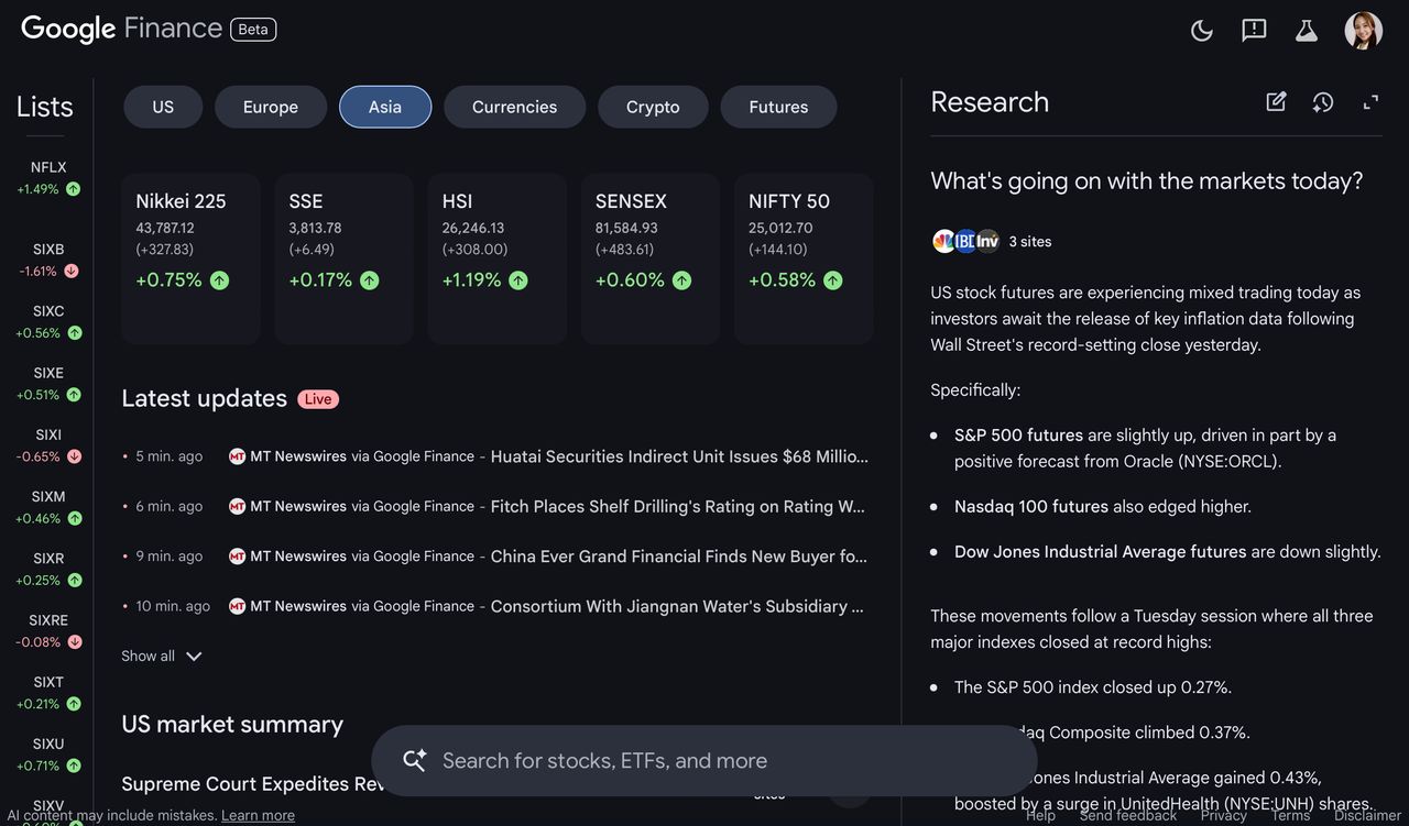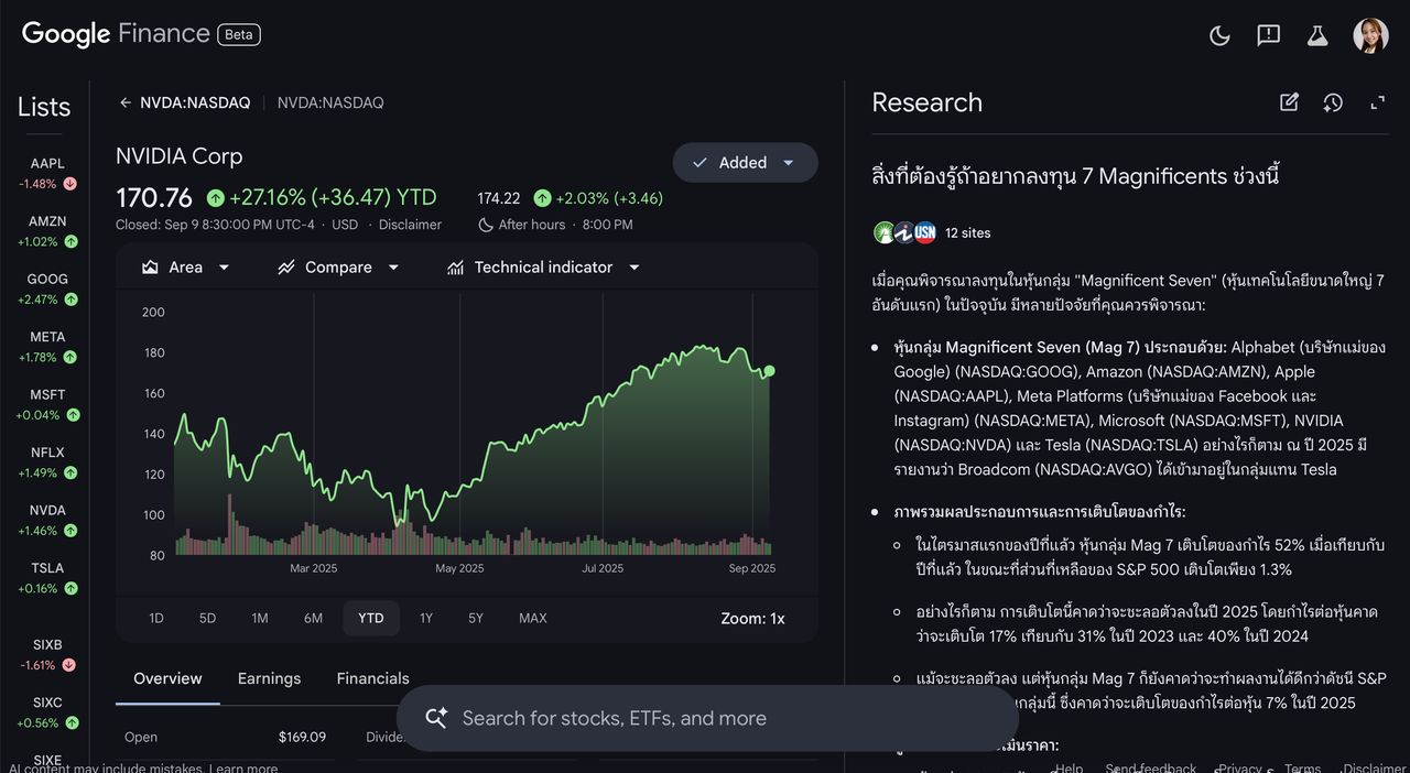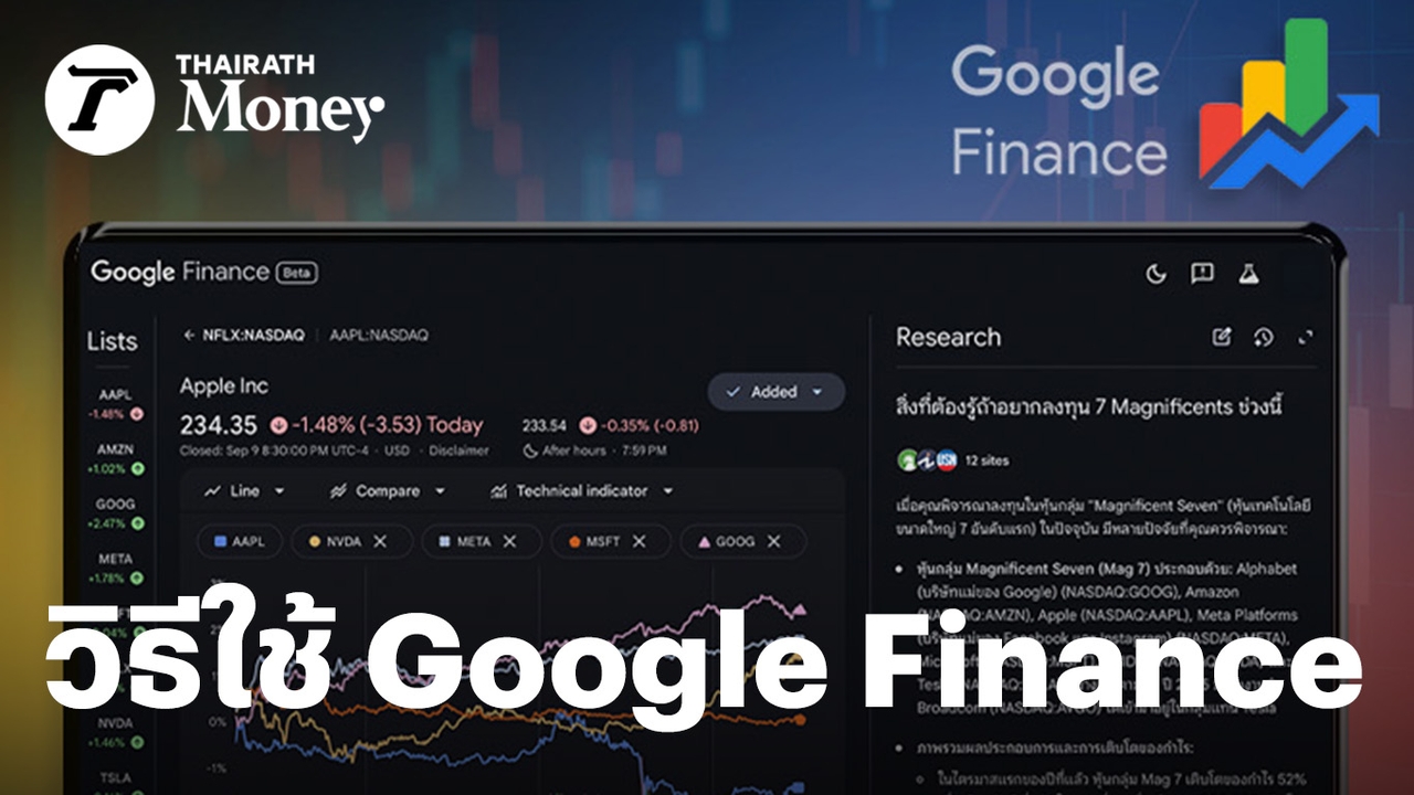 "Google Finance” แพลตฟอร์มติดตามตลาดการเงินฟรีจาก Google เครื่องมือใหม่สำหรับสายหุ้นสายการเงิน ที่มาพร้อมกับเครื่องมือ AI วิเคราะห์ข้อมูลตลาดเงินและตลาดหุ้นเชิงลึกลดขั้นตอนยุ่งยากและเพิ่มความยืดหยุ่นในการวิเคราะห์ตลาด เข้าถึงข้อมูลบริษัทจดทะเบียน ข้อมูลตลาด ราคาหุ้น กองทุน ETF และค่าเงินแบบเรียลไทม์ทั่วโลก พร้อมกราฟเชิงโต้ตอบและข่าวธุรกิจที่อัปเดตอยู่เสมอ และที่สำคัญยังมี ‘แชตบอต AI’ ตอบคำถามเชิงลึกได้สะดวกยิ่งขึ้น