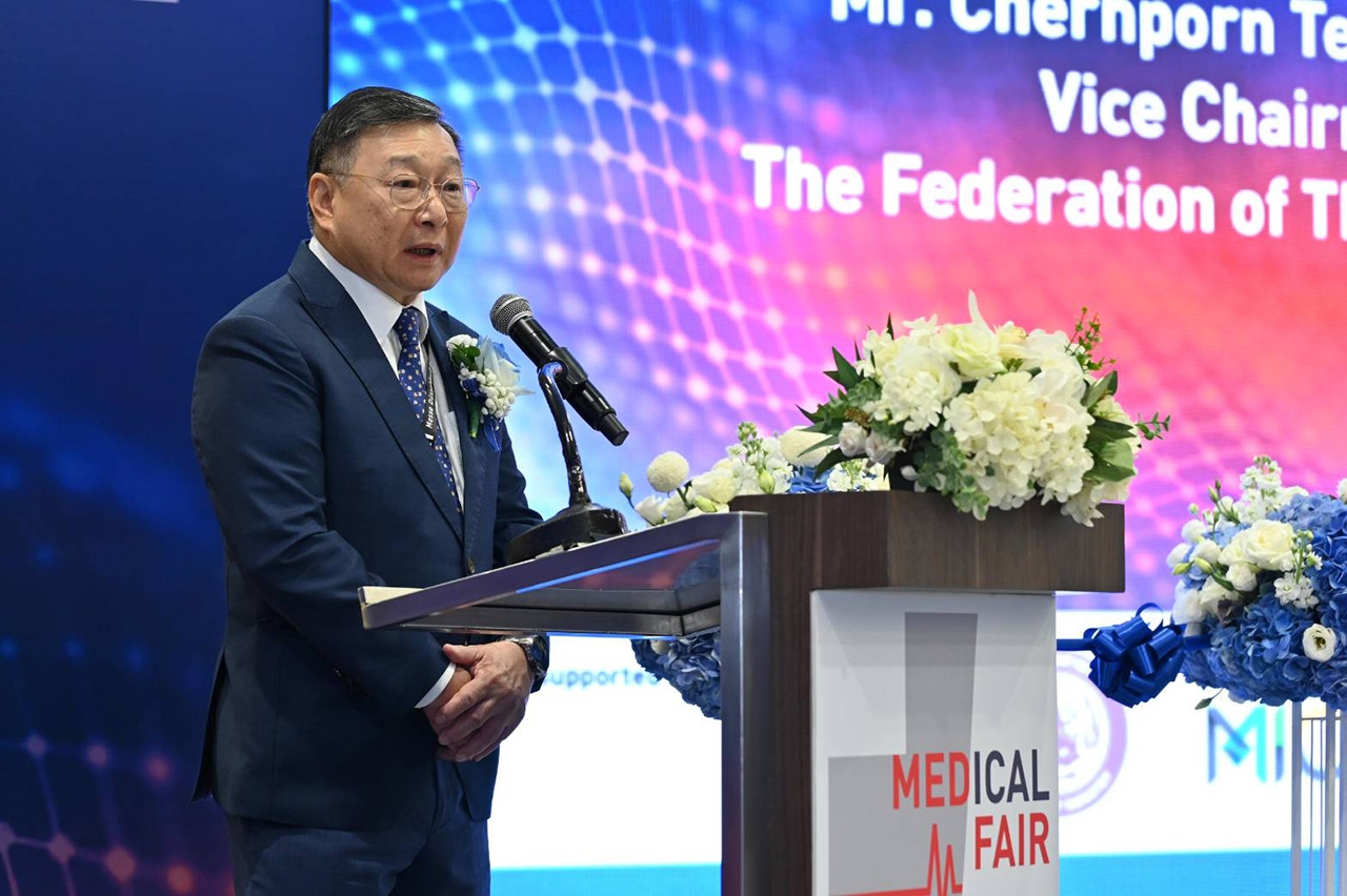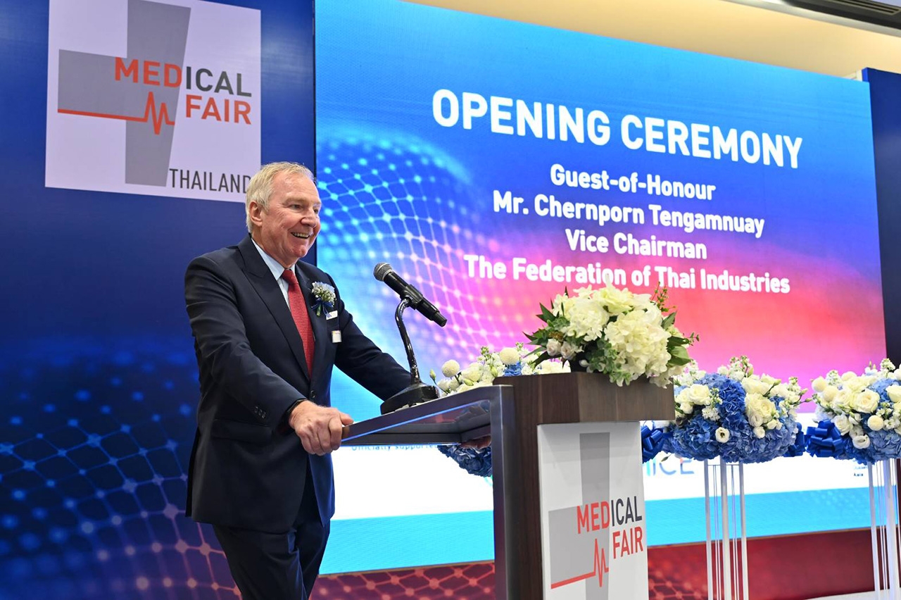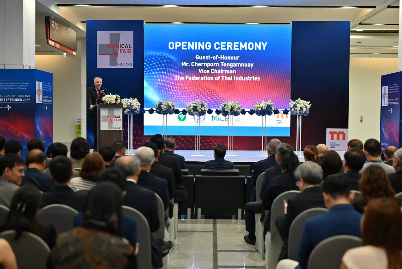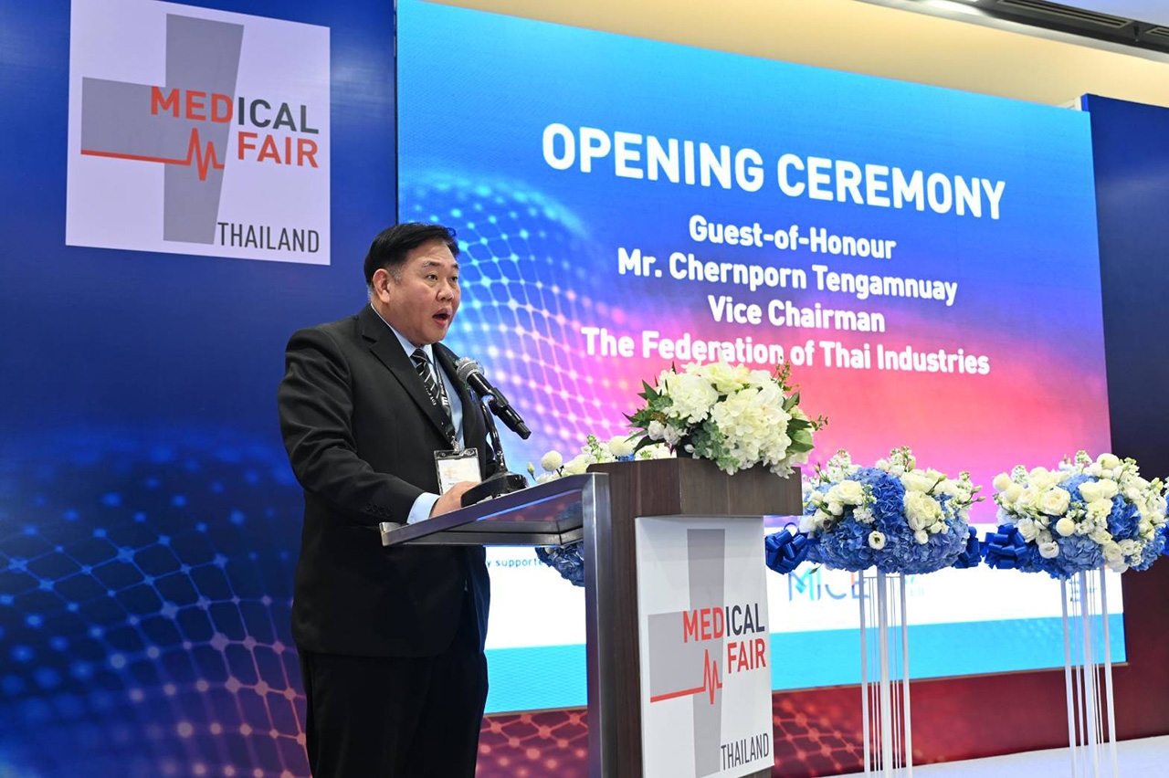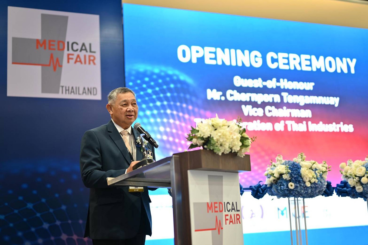 ทั้งนี้ ในพิธีเปิดงาน MEDICAL FAIR THAILAND 2025 อย่างเป็นทางการ ได้รับเกียรติจาก ภก. ดร. เชิญพร เต็งอำนวย รองประธานสภาอุตสาหกรรมแห่งประเทศไทย เป็นประธานพิธีเปิดงาน โดยกล่าวสนับสนุนว่า “ประเทศไทยได้รับการยอมรับมาอย่างยาวนานในฐานะศูนย์กลางด้านการดูแลสุขภาพของอาเซียน ที่มีโรงพยาบาลรับรองมาตรฐานสากลกว่า 60 แห่ง บุคลากรทางการแพทย์ที่เชี่ยวชาญ และภาคเอกชนที่แข็งแกร่ง อีกทั้งประเทศไทยยังเป็นจุดหมายปลายทางด้านการท่องเที่ยวเชิงสุขภาพชั้นนำ โดยคาดการณ์ตลาดเครื่องมือแพทย์ไทยจะโตสูงถึง 2.5 พันล้านดอลลาร์สหรัฐภายในปีพ.ศ.2571 ซึ่งทางสภาอุตสาหกรรมแห่งประเทศไทย ได้กำหนดยุทธศาสตร์สำคัญผ่านนโยบาย “4 GO” ได้แก่ GO Digital & AI, GO Innovation, GO Global และ GO Green ซึ่งจะช่วยให้ผู้ประกอบการภาคอุตสาหกรรมมีความเตรียมพร้อมในการแข่งขันเวทีสากลได้ นอกจากนี้ยังมีการจัดตั้งคลัสเตอร์อุตสาหกรรมสุขภาพและความงาม ประกอบด้วย 7 กลุ่มอุตสาหกรรม ได้แก่ ยา อาหารและเครื่องดื่ม ผู้ผลิตเครื่องมือแพทย์ สมุนไพร เครื่องสำอาง ผลิตภัณฑ์เสริมอาหาร และเทคโนโลยีชีวภาพ ขึ้น เพื่อผลักดันให้ประเทศไทยก้าวขึ้นเป็นศูนย์กลางเศรษฐกิจสุขภาพในอาเซียน ตลอดจนการส่งเสริมให้ผู้ประกอบการในอุตสาหกรรมยานยนต์ปรับเปลี่ยนสายการผลิตจากชิ้นส่วนยานยนต์ไปสู่การผลิตเครื่องมือแพทย์ เช่น อุปกรณ์ช่วยหายใจ ชิ้นส่วนเครื่องมือวินิจฉัย และอุปกรณ์ทางการแพทย์อื่น ๆ