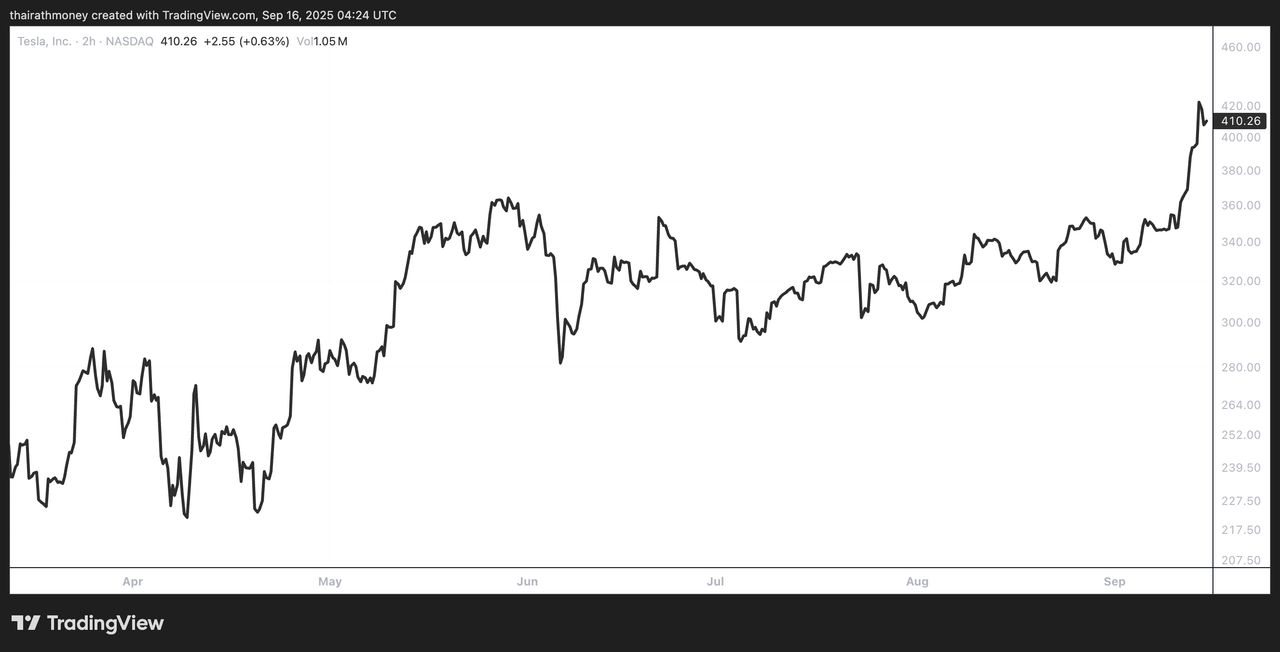 ราคาหุ้น Tesla กระโดดขึ้น 3.6% เมื่อวันจันทร์ที่ 15 กันยายนที่ผ่านมา ปิดที่ 410.26 ดอลลาร์สหรัฐต่อหุ้น สูงกว่าราคา ณ สิ้นปี 2024 กว่า 6 ดอลลาร์สหรัฐต่อหุ้น และทะยานขึ้นแล้วถึง 85% จากจุดต่ำสุดที่ 221.86 ดอลลาร์สหรัฐต่อหุ้น เมื่อวันที่ 4 เมษายนที่ผ่านมา