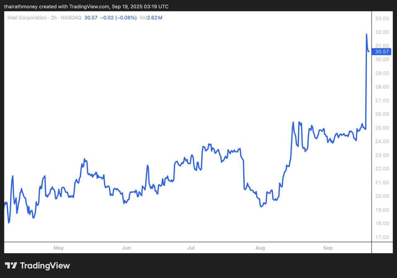 หุ้นของ Intel ซึ่งเคยแตะระดับต่ำสุดในรอบกว่าทศวรรษเมื่อช่วงต้นปีนี้ ได้ดีดตัวกลับขึ้นมาหลังจากได้รับการสนับสนุนครั้งใหม่จากรัฐบาลของทรัมป์ โดยได้ทำข้อตกลงให้รัฐบาลสหรัฐฯ เข้าลงทุน 10% ใน Intel เมื่อเดือนสิงหาคมที่ผ่านมา