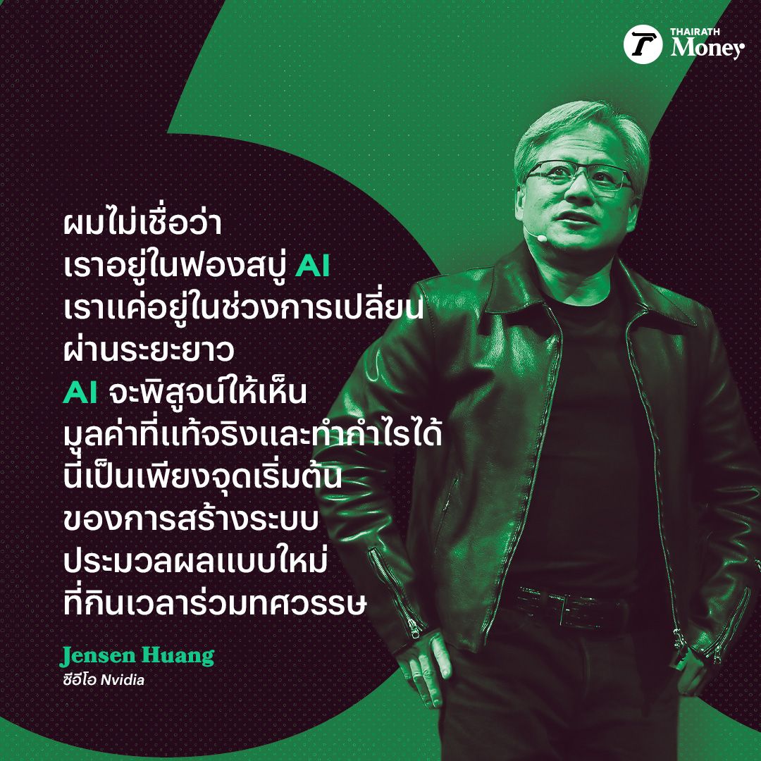 “ผมไม่เชื่อว่าเราอยู่ในฟองสบู่ AI เราแค่อยู่ในช่วงการเปลี่ยนผ่านระยะยาว AI จะพิสูจน์ให้เห็นมูลค่าที่แท้จริงและทำกำไรได้ นี่เป็นเพียงจุดเริ่มต้นของการสร้างระบบประมวลผลแบบใหม่ที่กินเวลาร่วมทศวรรษ”