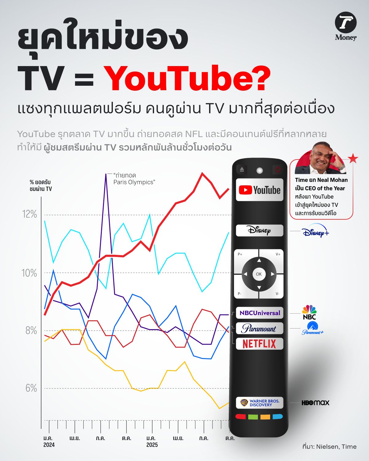 ตามรายงาน The Gauge ของ Nielsen ชี้ว่า นับตั้งแต่ต้นปี 2025 ที่ผ่านมาเปอร์เซ็นต์ส่วนแบ่งของการรับชมผ่านหน้าจอ TV ที่บ้าน YouTube มีสัดส่วนมากที่สุดมาต่อเนื่อง แซงหน้าสตรีมมิงอย่าง Disney ที่มี Disney, Netflix และ Warner Bros. ที่มี HBO Max